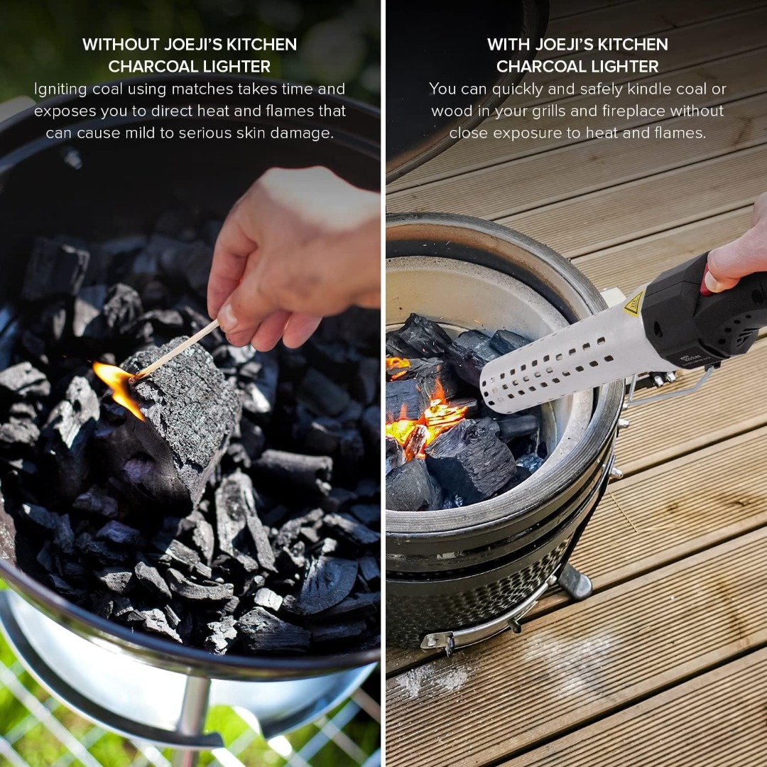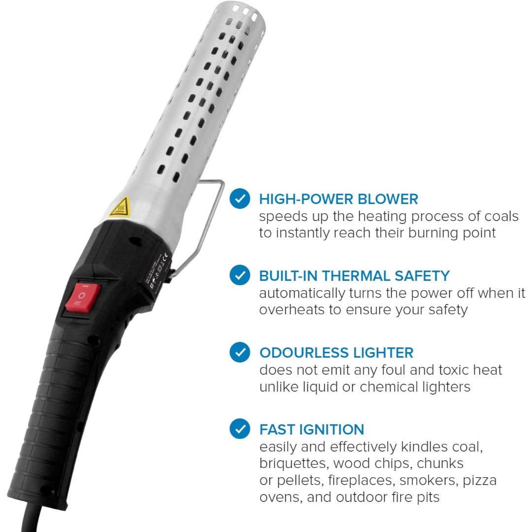 لأسباب تتعلق بالسلامة ، لا يمكن فتح عنصر التسخين الموجود على ولاعة شواية الفحم إلا بمفتاح أمان خاص قابل للإزالة. أخف شواية الفحم القوية ولكن خفيفة الوزن لها مقبض قوي للحفاظ على الثبات ، ويمكن محاذاتها بسهولة بالزاوية الصحيحة للتكيف مع النار.