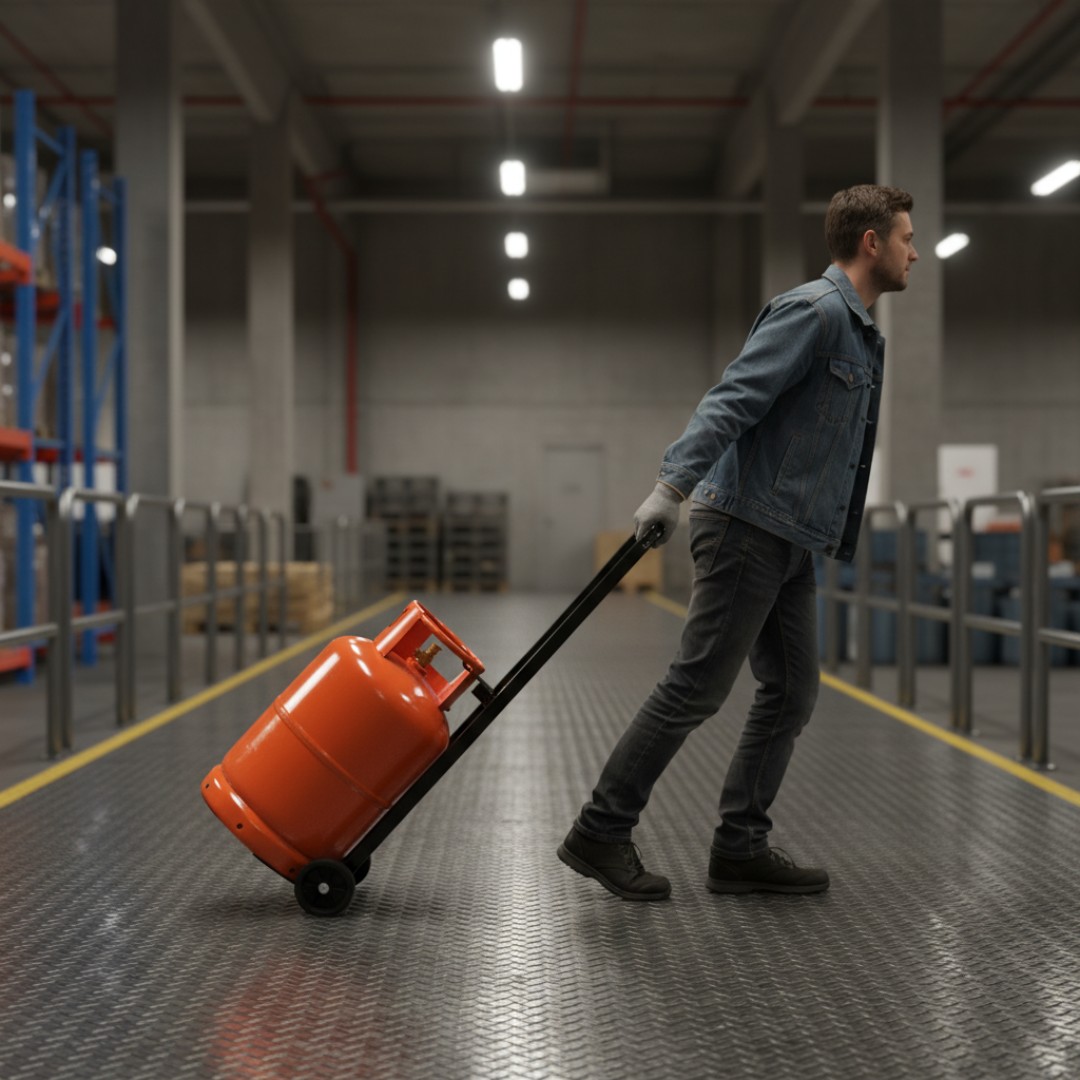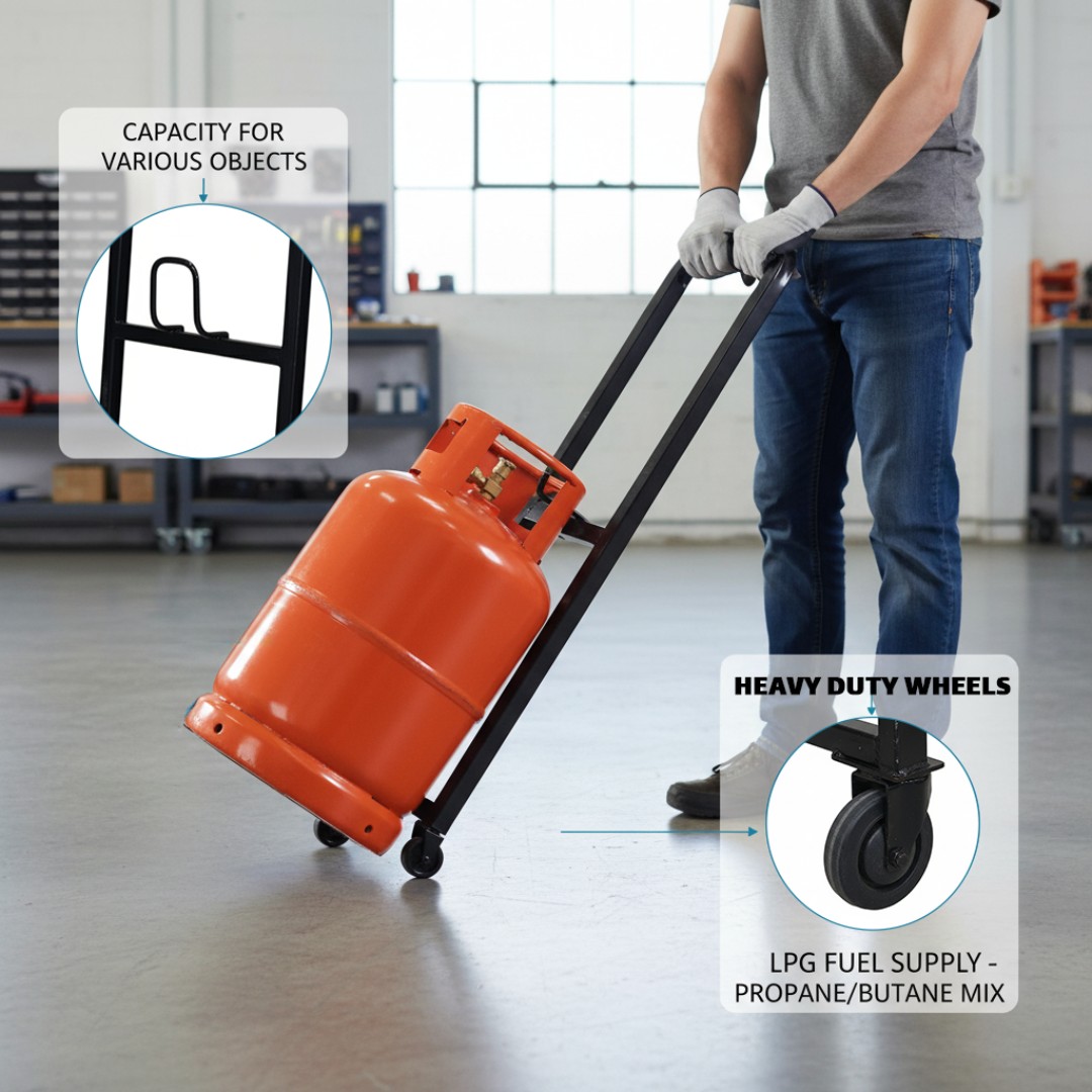 هيكل فولاذي متين: مصنوع من إطار فولاذي قوي ومتين مصمم لتحمل ونقل أسطوانات الغاز والأحمال الثقيلة بأمان حتى وزن 50 كجم.