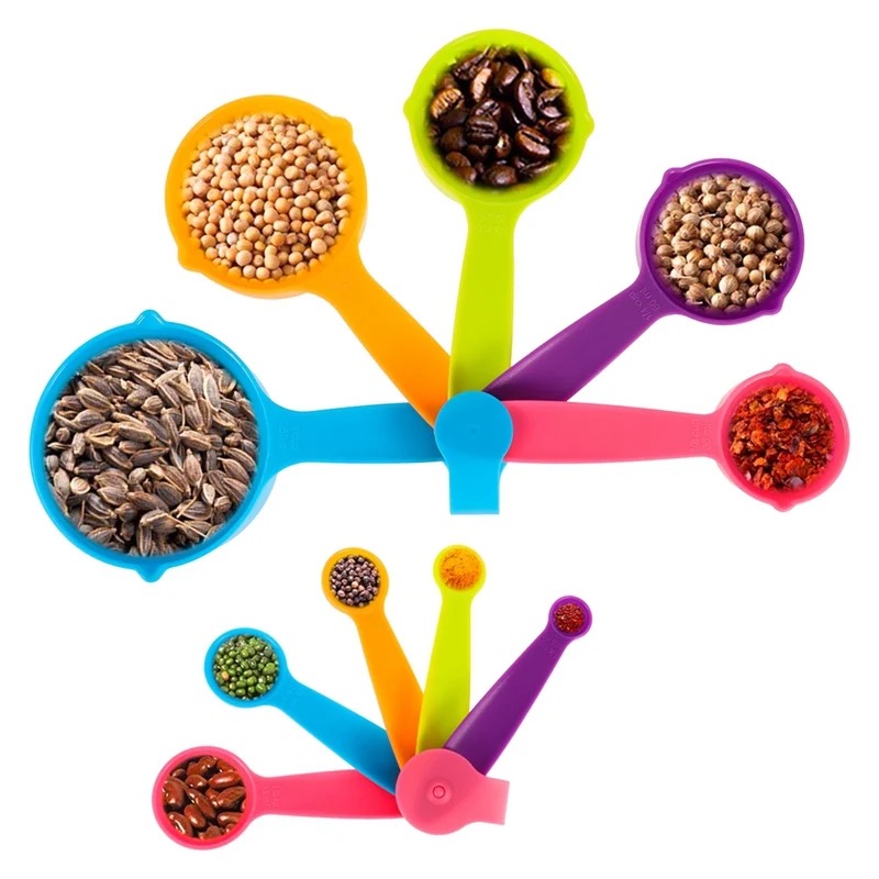 سهلة القراءة: تحتوي هذه الأكواب والملاعق على قياسات مخبوزة على مقبضها لقراءة واستخدام سهلين. كل كوب وملعقة لها لون فريد وسعة.