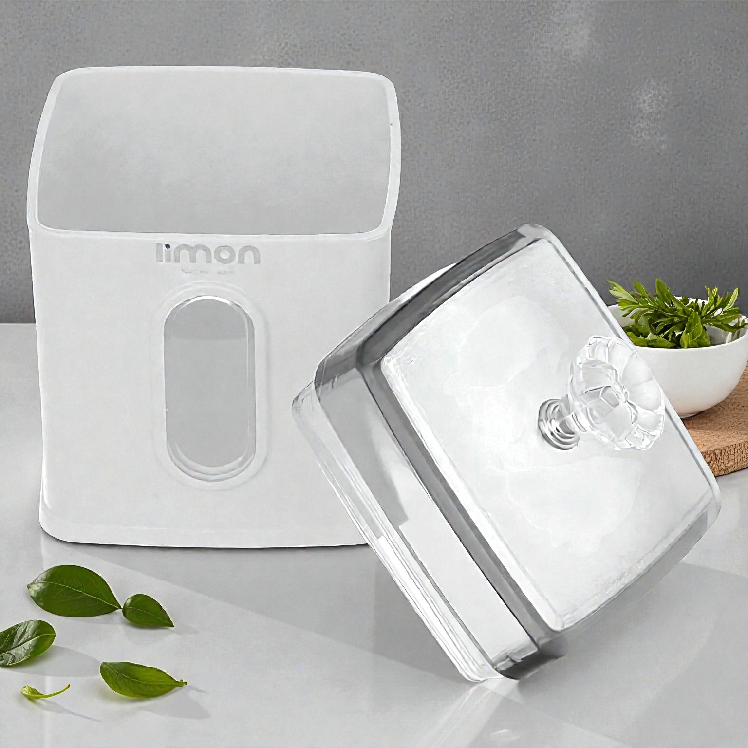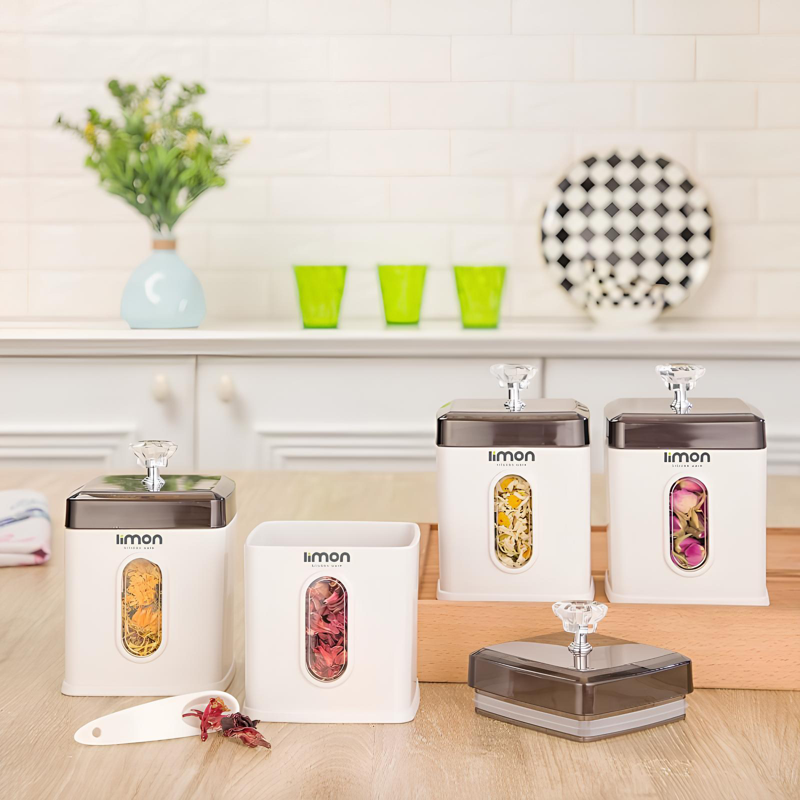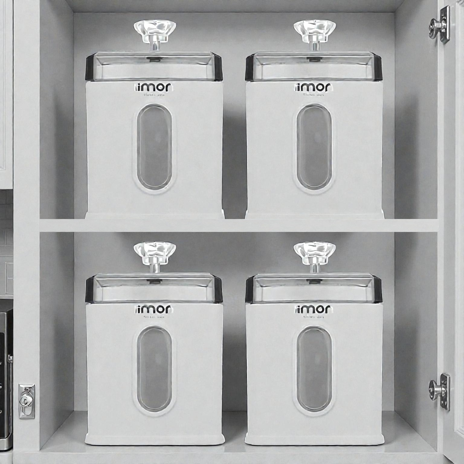 مجموعة تخزين متكاملة من 4 قطع: تتكوّن من أربع حاويات متطابقة بسعة 1.7 لتر لكل منها، مثالية لتنظيم الحبوب والبقوليات والمعكرونة وحبوب الإفطار وغيرها من المواد الجافة.