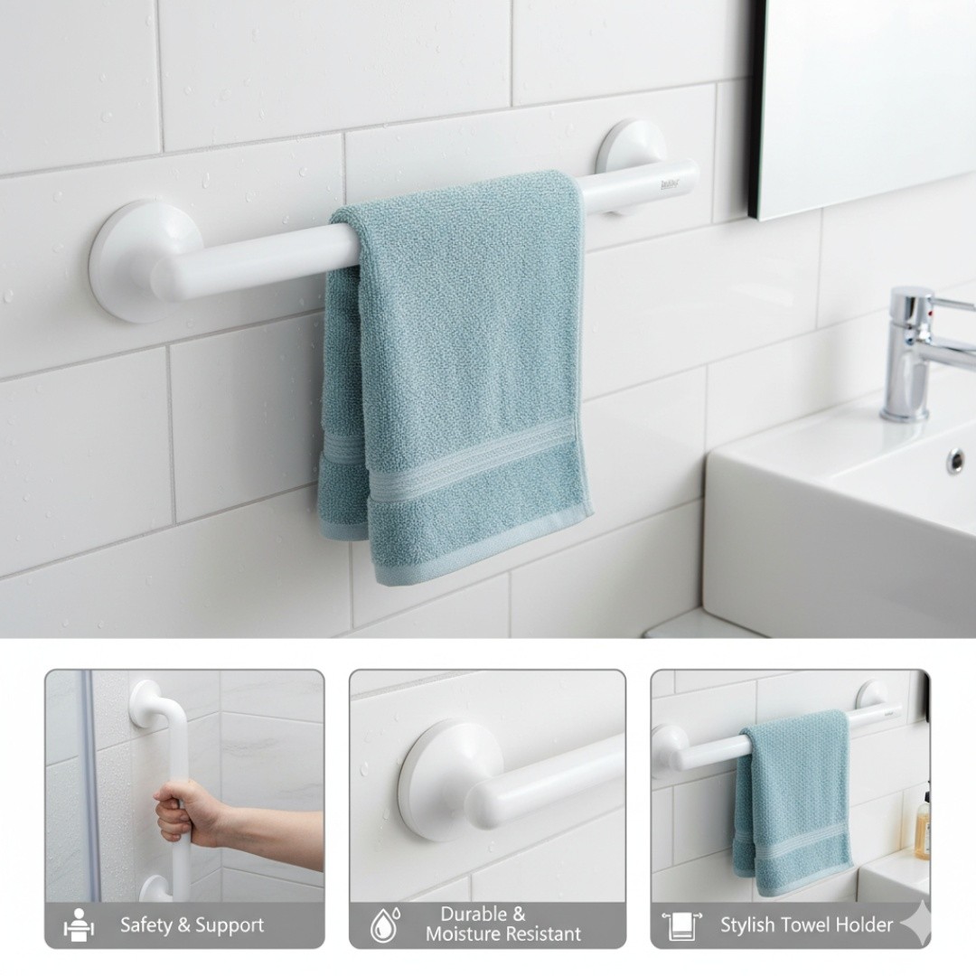استخدام متعدد الوظائف – مصمم ليعمل كمسكة دعم موثوقة لتوفير الأمان الإضافي، بالإضافة إلى كونه علاقة عملية للمناشف أو الملابس أو أردية الحمام، مما يجعله إضافة متعددة الاستخدامات لأي حمّام.