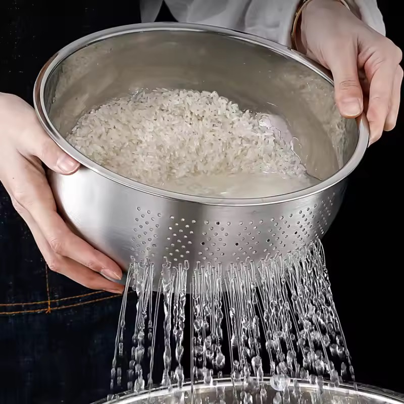 مصمم بجوانب مائلة وقاعدة مثقبة تسمح بتصريف الماء بسرعة، مع الحفاظ على جزيئات الطعام الصغيرة—مثالي للشطف والتصفية بسهولة.