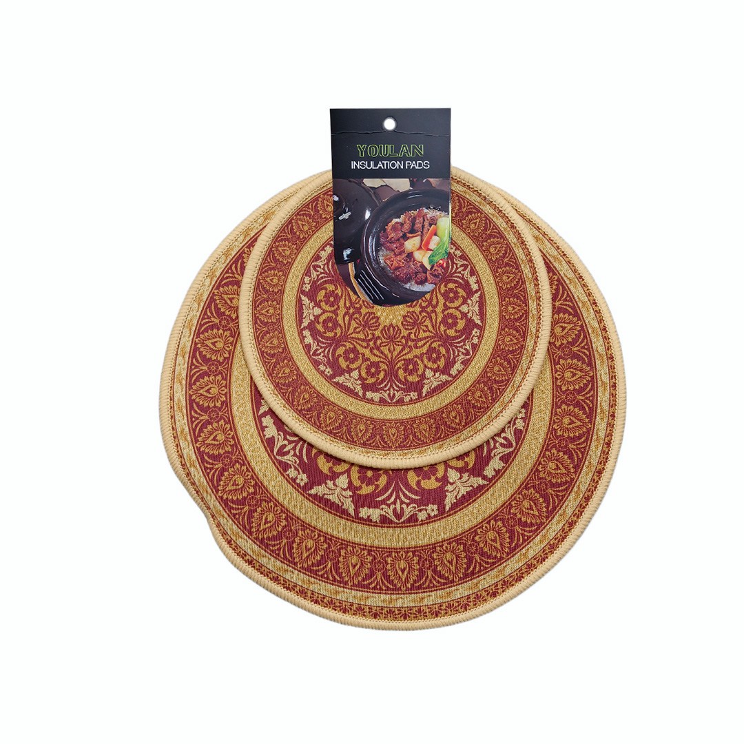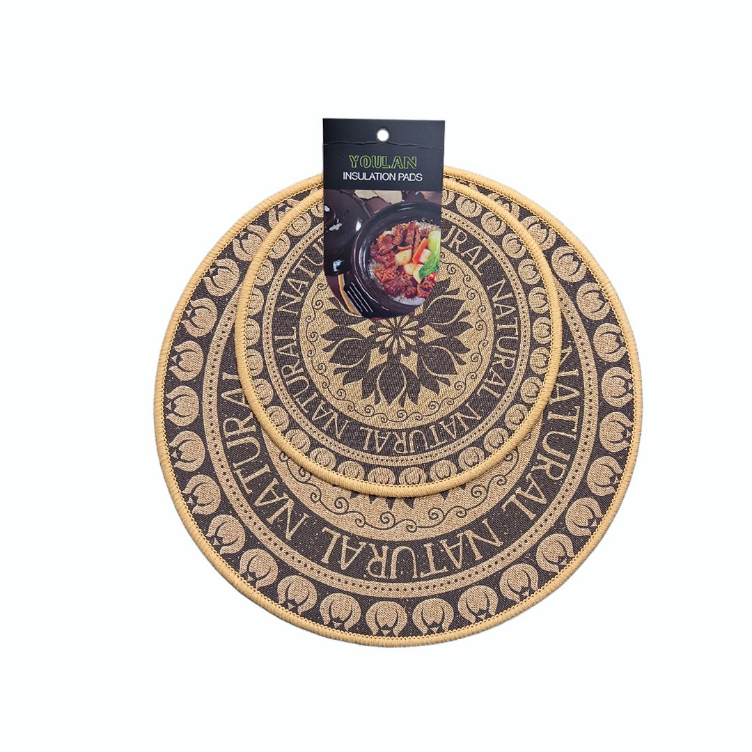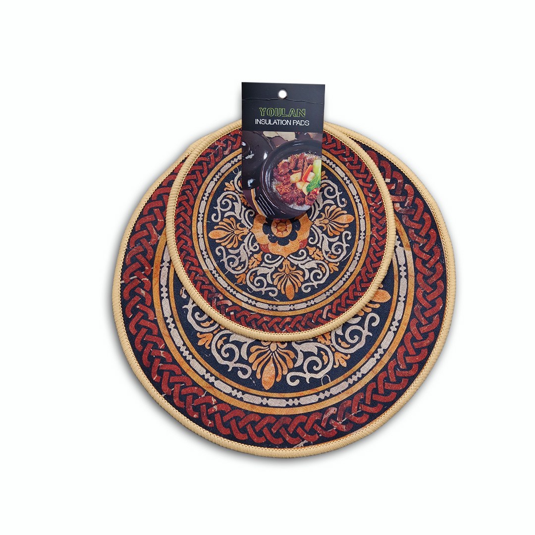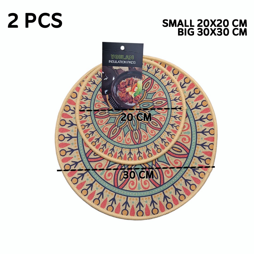 طقم بحجمين مزدوجين – يأتي مع قطعتين عازلتين دائريتين: واحدة صغيرة (20 × 20 سم) وأخرى كبيرة (30 × 30 سم)، مثاليتان للأواني الساخنة، الأطباق، أو إبريق الشاي بأحجام مختلفة.