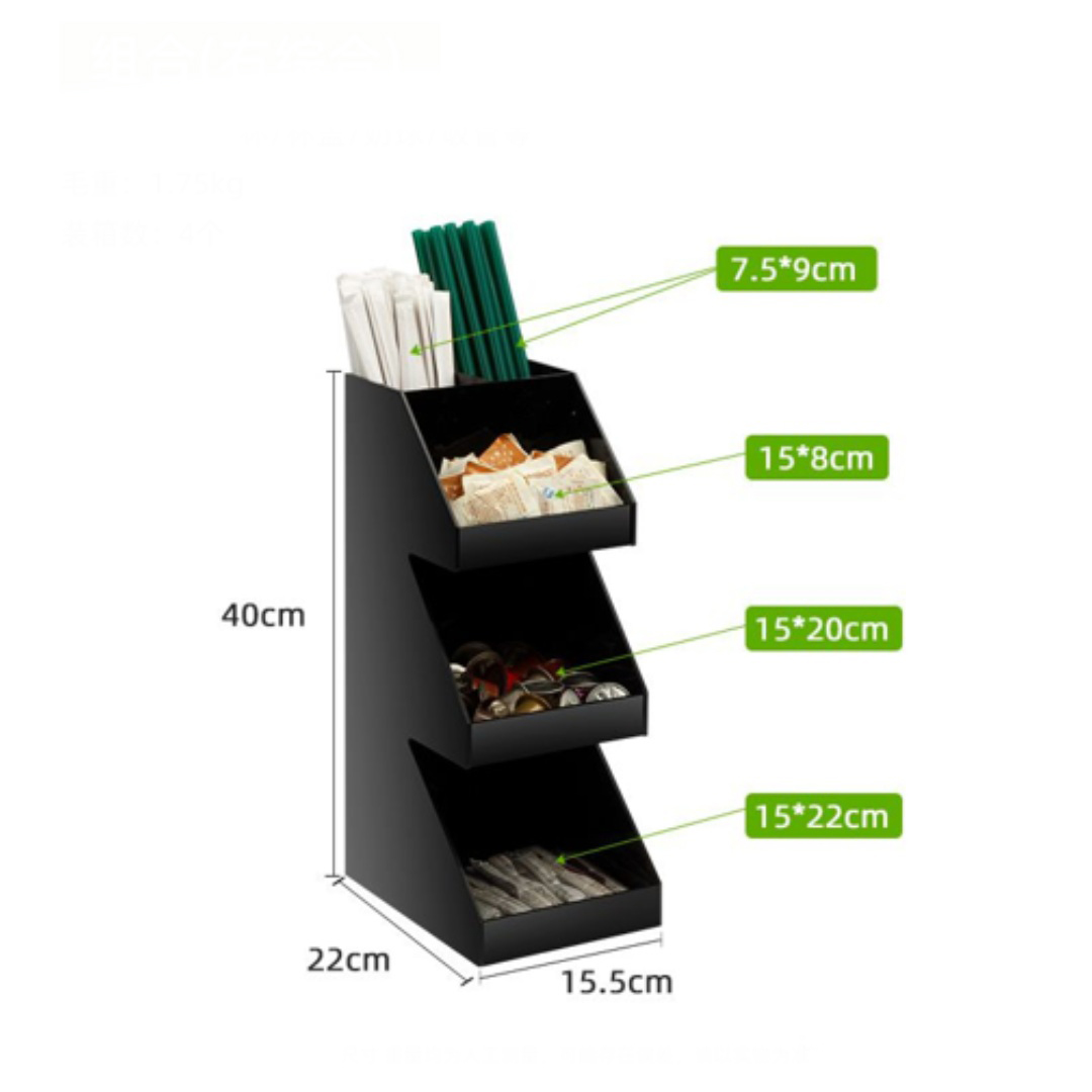 تصميم عمودي موفر للمساحة: يتميز هذا المنظم ذو الثلاث طبقات بخمسة أقسام مائلة لتخزين القش، السكر، أكياس الشاي، الكريمات، والمزيد بشكل مرتب مع الاستفادة القصوى من المساحة العمودية.