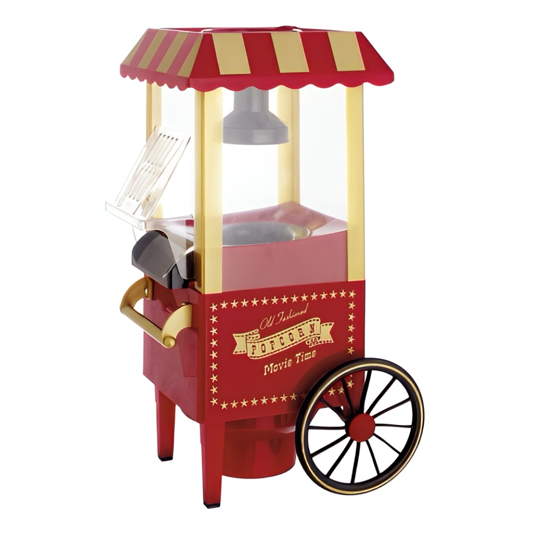 تصميم كلاسيكي عتيق – يتميز بمظهر عربة الفشار القديمة مع ألوان حمراء وذهبية أنيقة، مما يضيف لمسة من الحنين إلى الماضي لأمسيات الأفلام أو الحفلات.