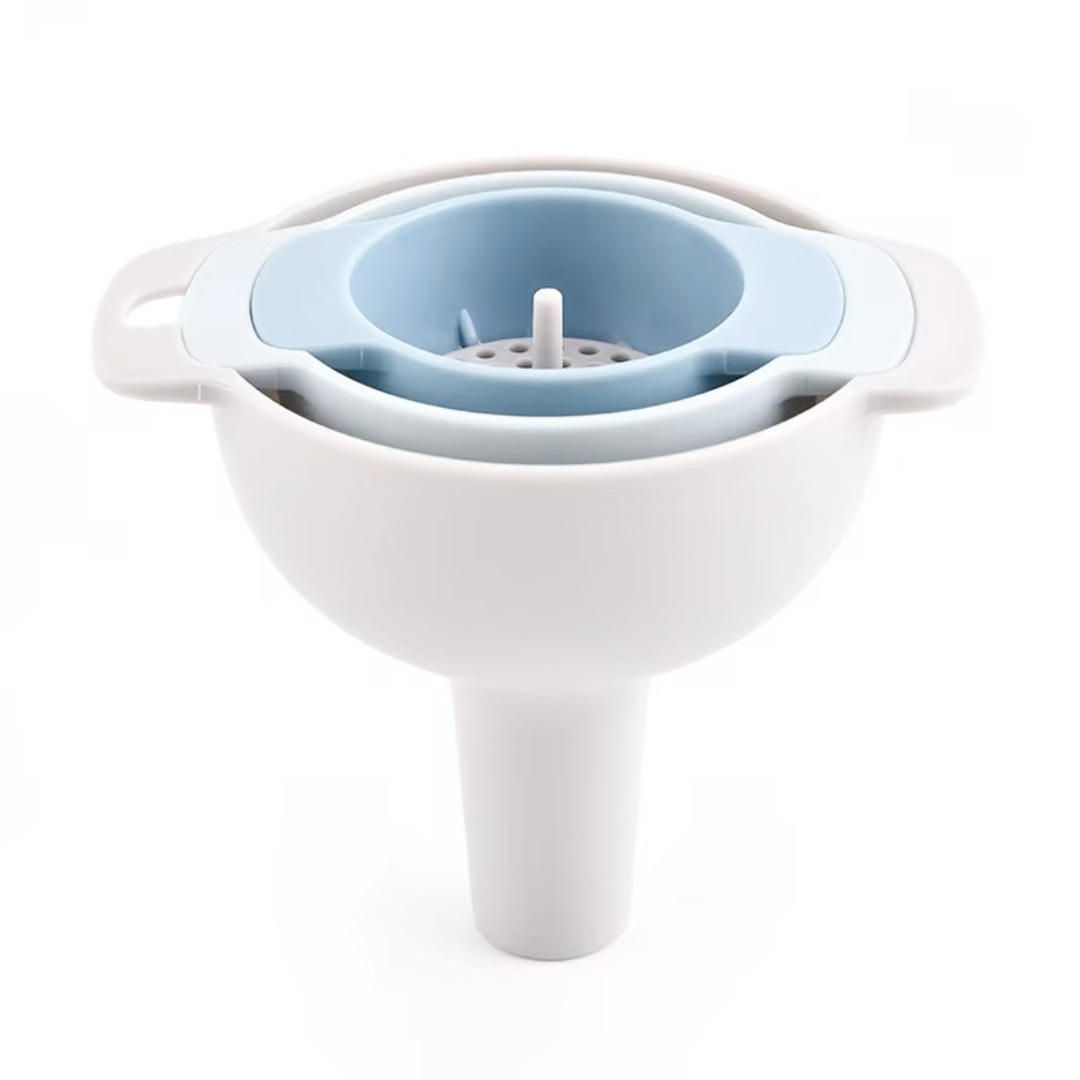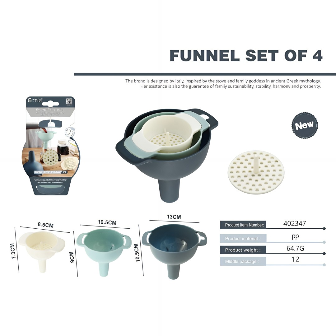 تصميم موفّر للمساحة – يتضمن الطقم أربع قمعات بأحجام مختلفة قابلة للتكديس داخل بعضها لتوفير مساحة التخزين في المطبخ.