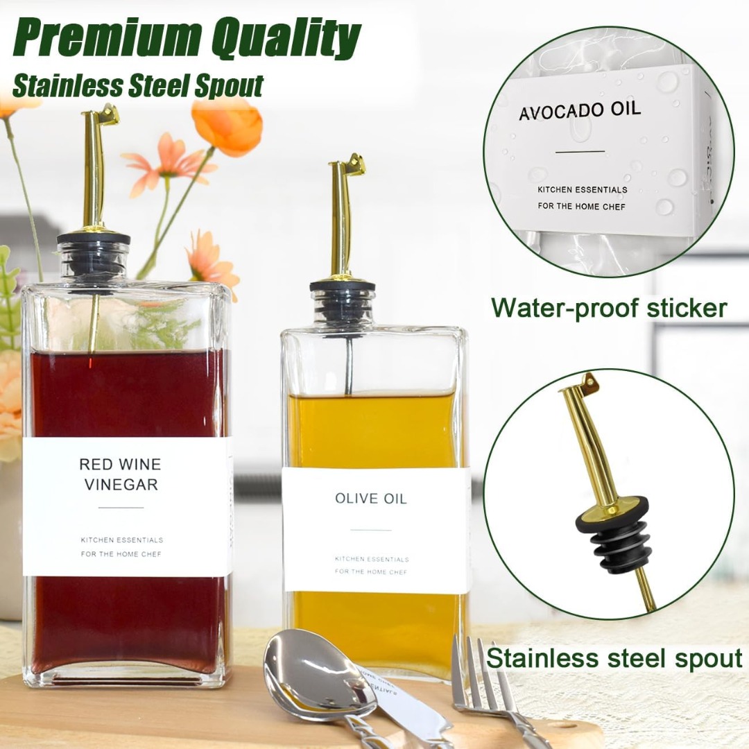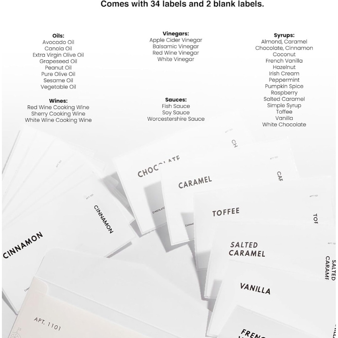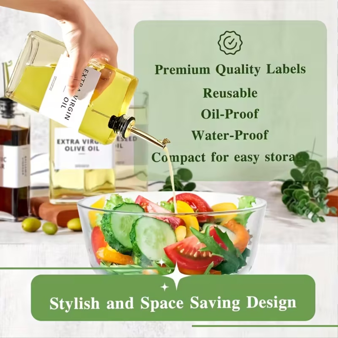يأتي مع 34 ملصقًا – يتضمن الطقم 34 ملصقًا مطبوعًا مسبقًا لأنواع الزيوت والخل والشراب والصلصات، بالإضافة إلى ملصقين فارغين لتخصيص الاستخدام بسهولة.
