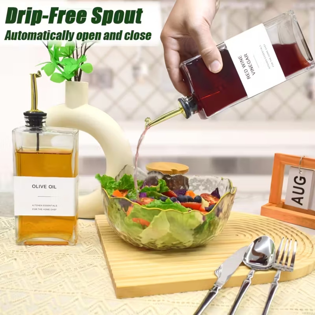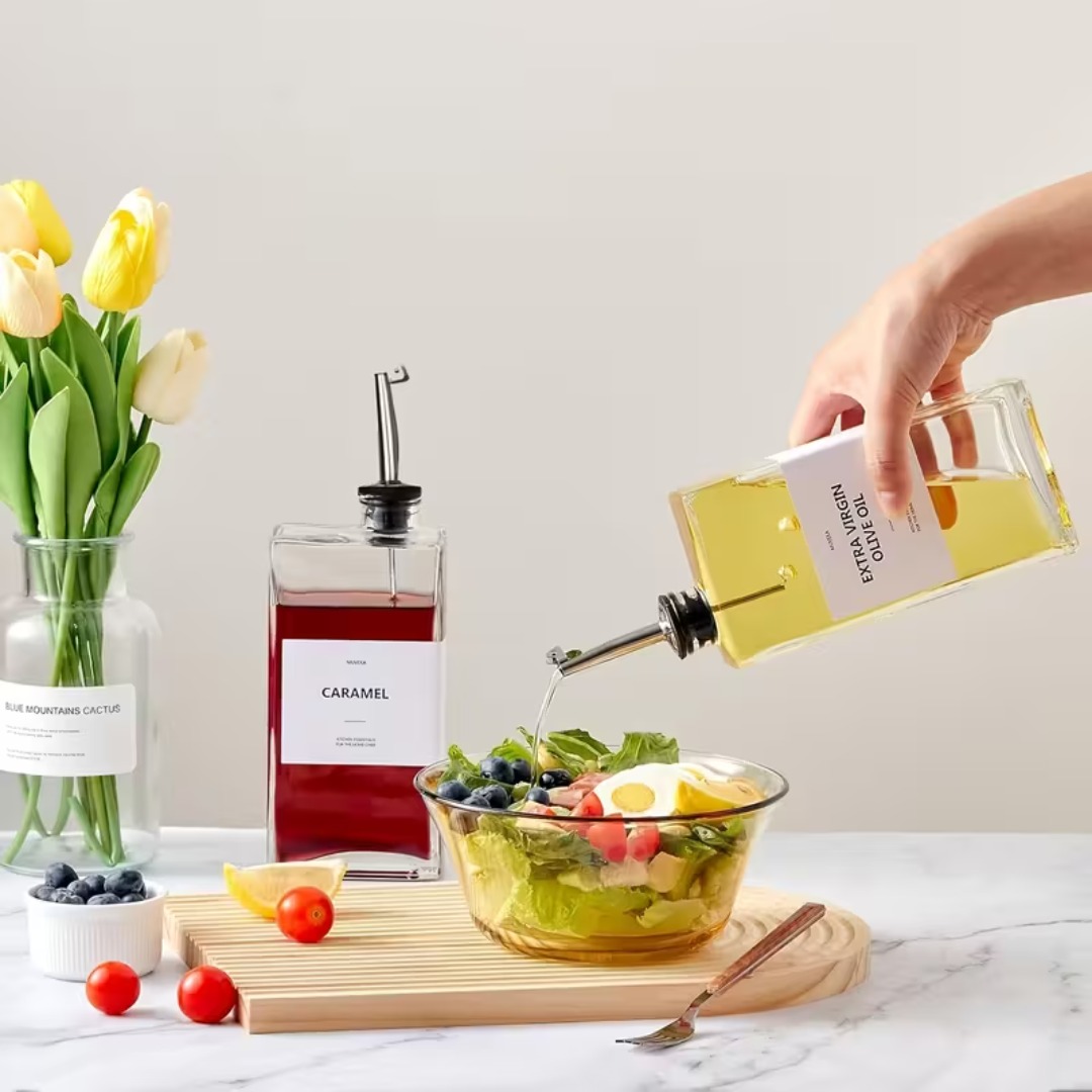 فوهة مانعة للتنقيط – تتميز زجاجات الزيت بفوهة دقيقة تمنع الانسكاب، مما يسهل سكب الزيت أو الخل أو الصلصات دون فوضى، مثالية للطهي والتقديم.