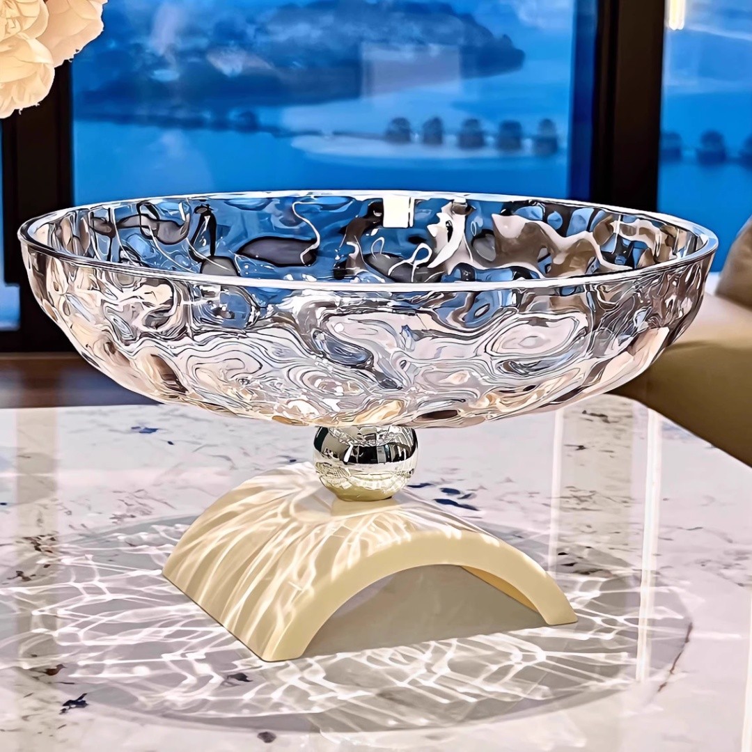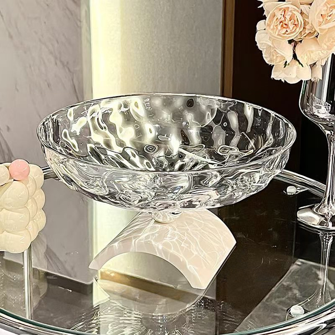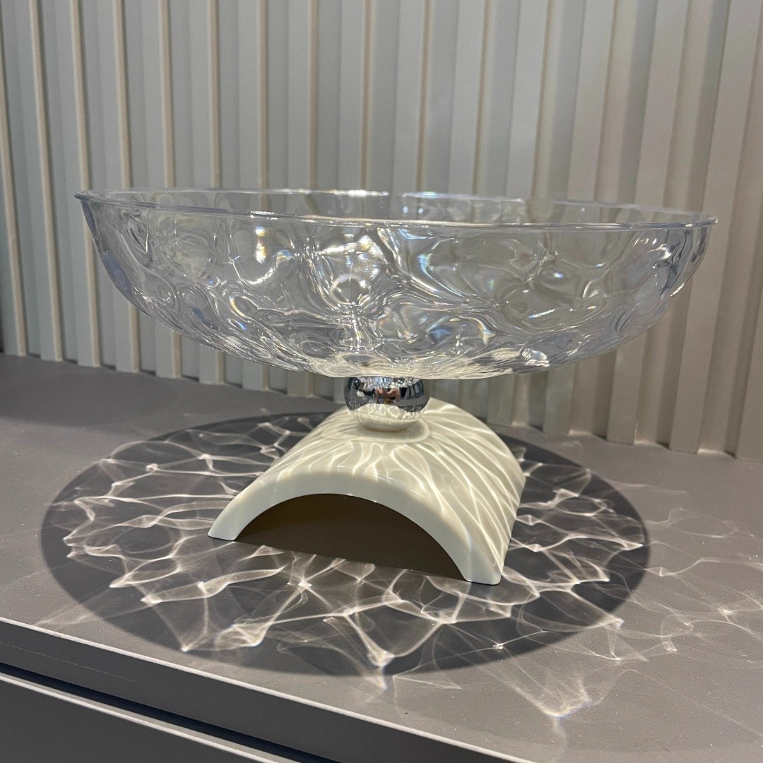 تصميم أنيق: يتميز بوعاء زجاجي شفاف بنقشة جذابة مع قاعدة بيضاء لامعة تضيف لمسة عصرية راقية لأي مساحة.