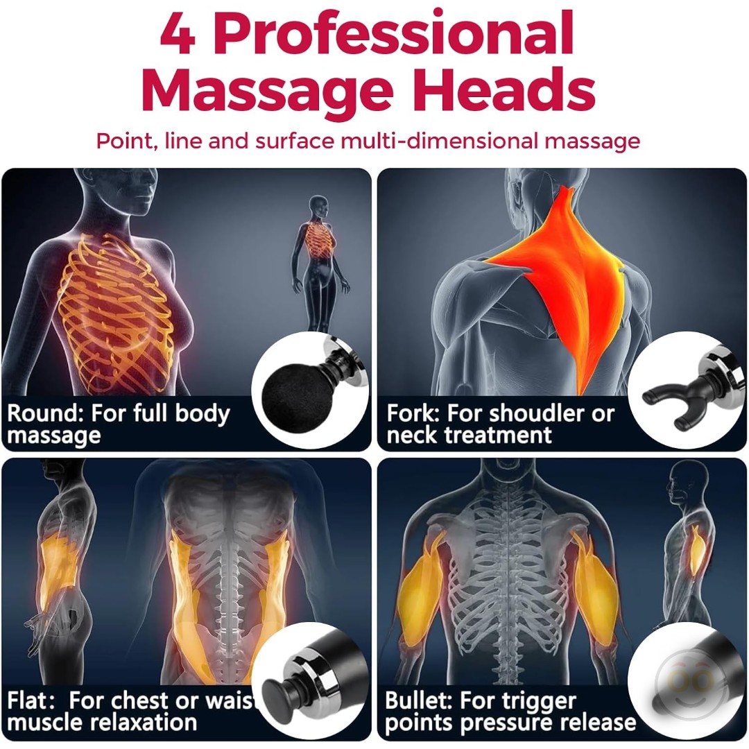 شاشة LCD ذكية و4 رؤوس تدليك – مزوّد بشاشة LCD توضح الوضع والسرعة ونسبة البطارية. يأتي مع 4 رؤوس تدليك قابلة للتبديل لاستهداف مجموعات عضلية مختلفة حسب الحاجة.