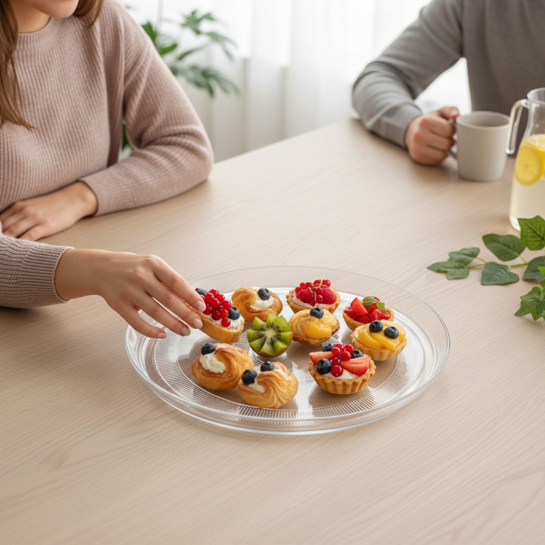 شفافية بلورية واضحة: مصنوع من بلاستيك عالي الجودة يعرض الحلويات والفواكه والوجبات الخفيفة بشكل جميل على أي طاولة.