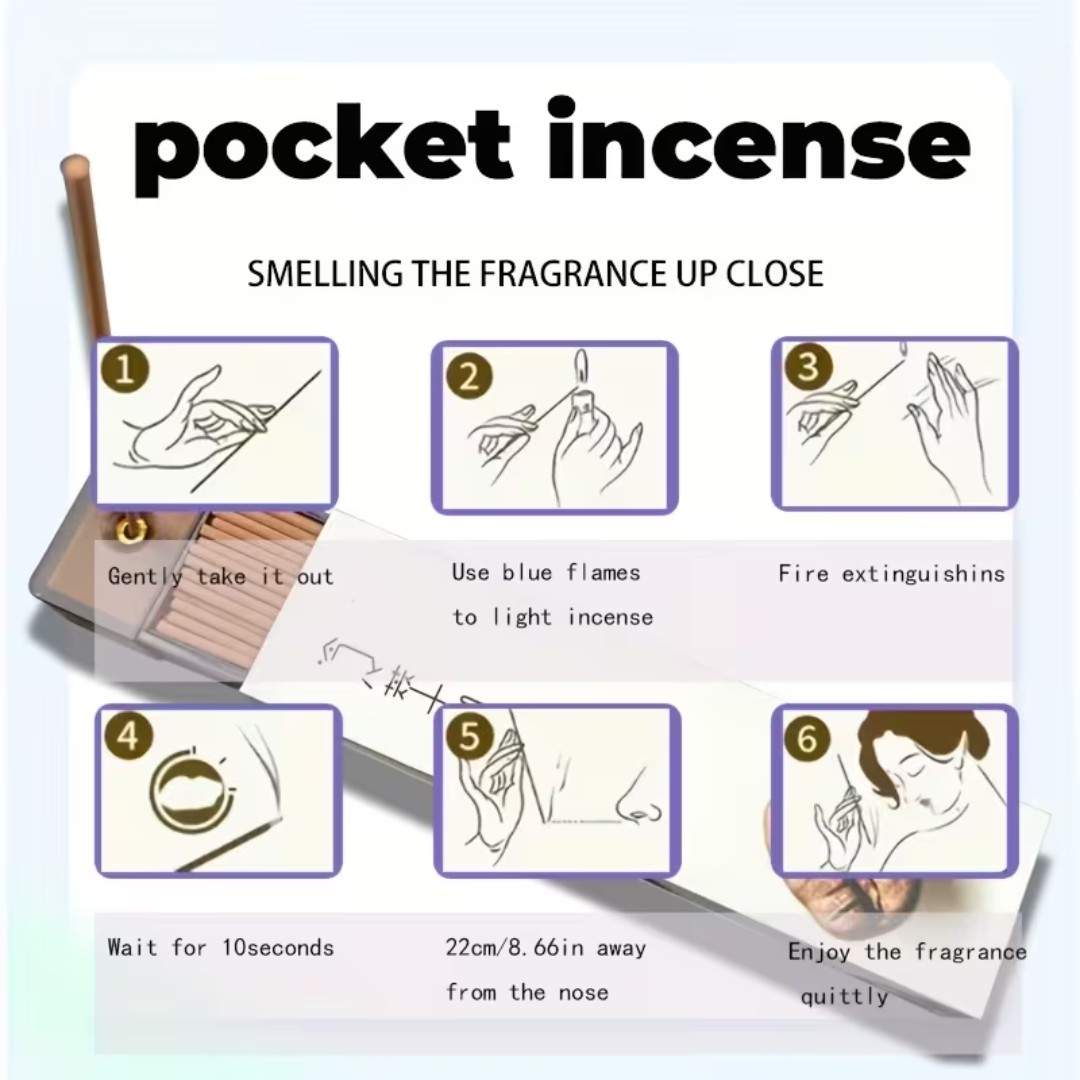 تصميم مدمج سهل الحمل: علبة بخور نحيفة وخفيفة الوزن يسهل وضعها في الجيوب أو الحقائب، مما يجعلها مناسبة للسفر والاستخدام الخارجي أو الحمل اليومي.