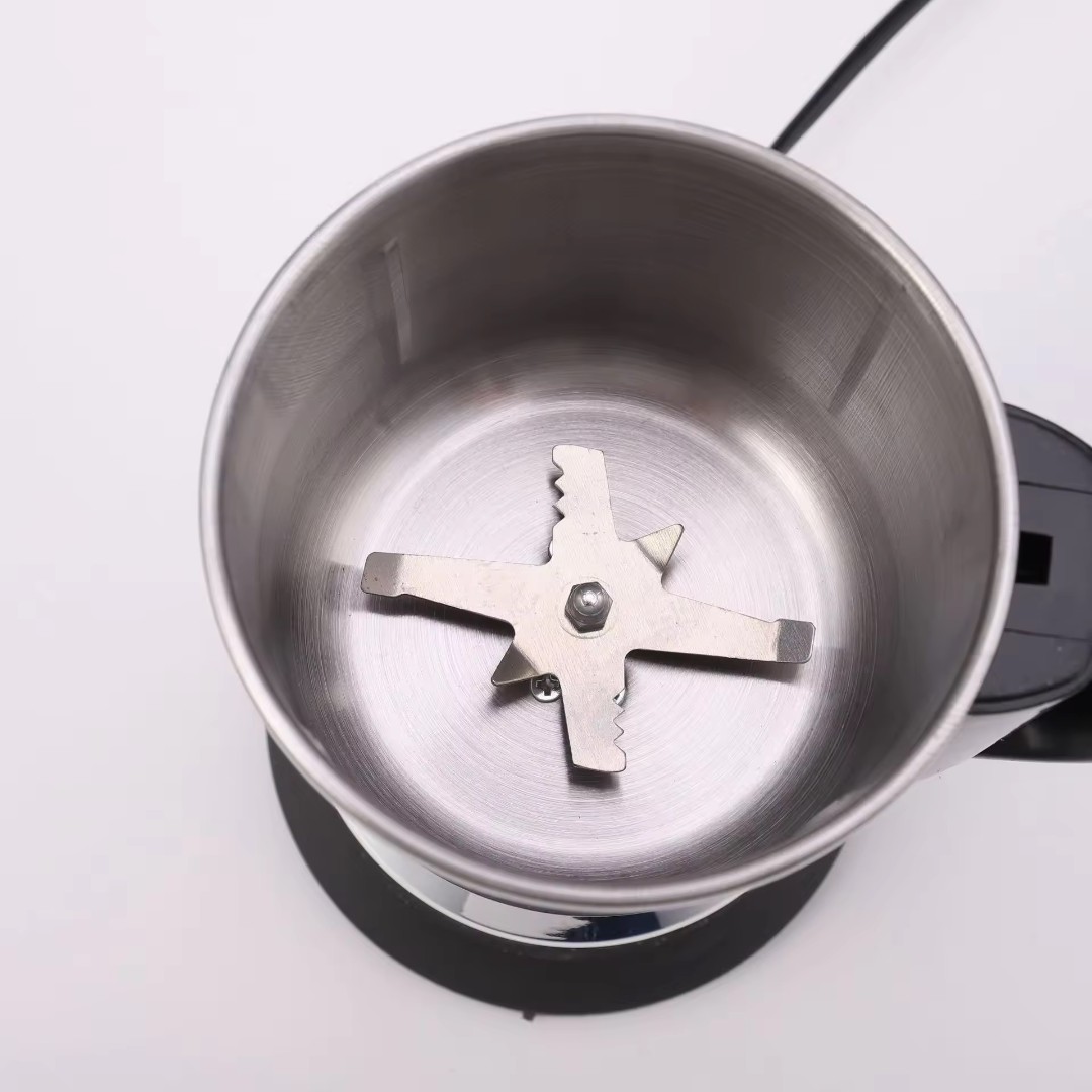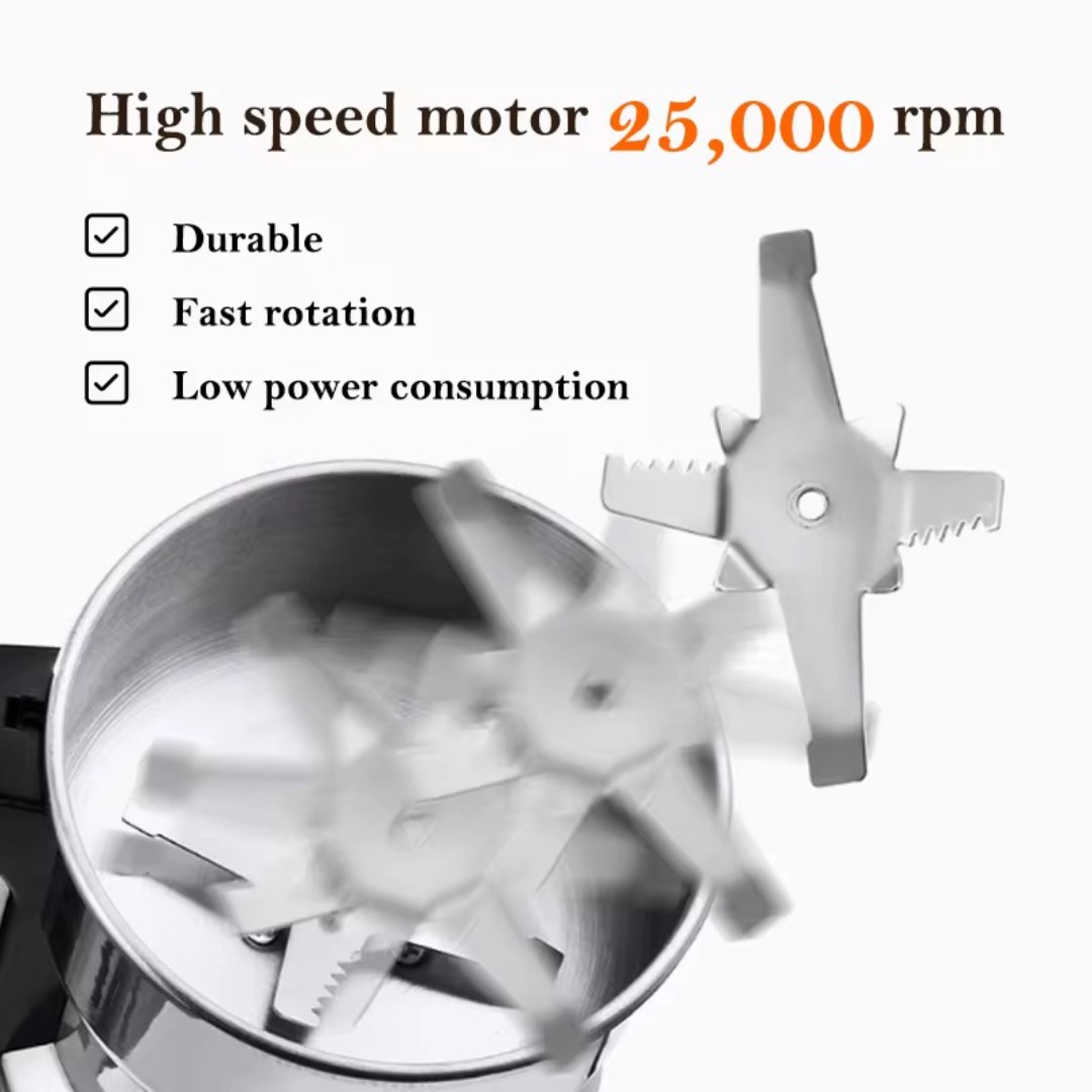 محرك قوي عالي السرعة: مزودة بمحرك قوي تصل سرعته إلى 25,000 دورة في الدقيقة، مما يسمح بطحن التوابل والأعشاب وحبوب القهوة والحبوب والمكونات الجافة بسرعة وكفاءة.