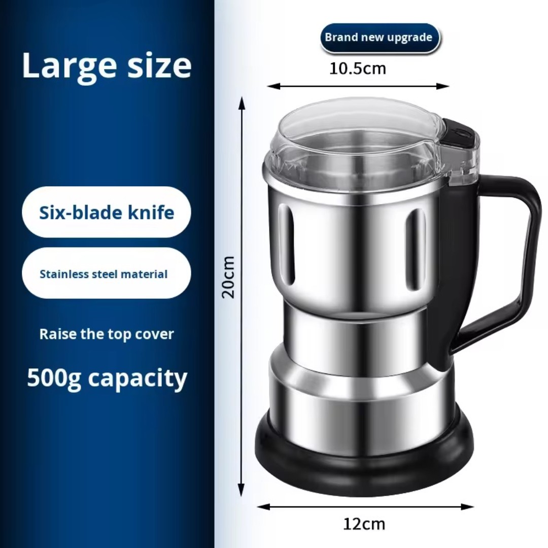 سعة طحن كبيرة 500 غرام: حجرة طحن واسعة تسمح بطحن كميات أكبر في وقت واحد، مما يجعلها مناسبة للمطابخ المنزلية وتحضير التوابل وطحن المكونات الغذائية.