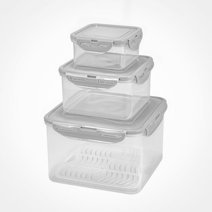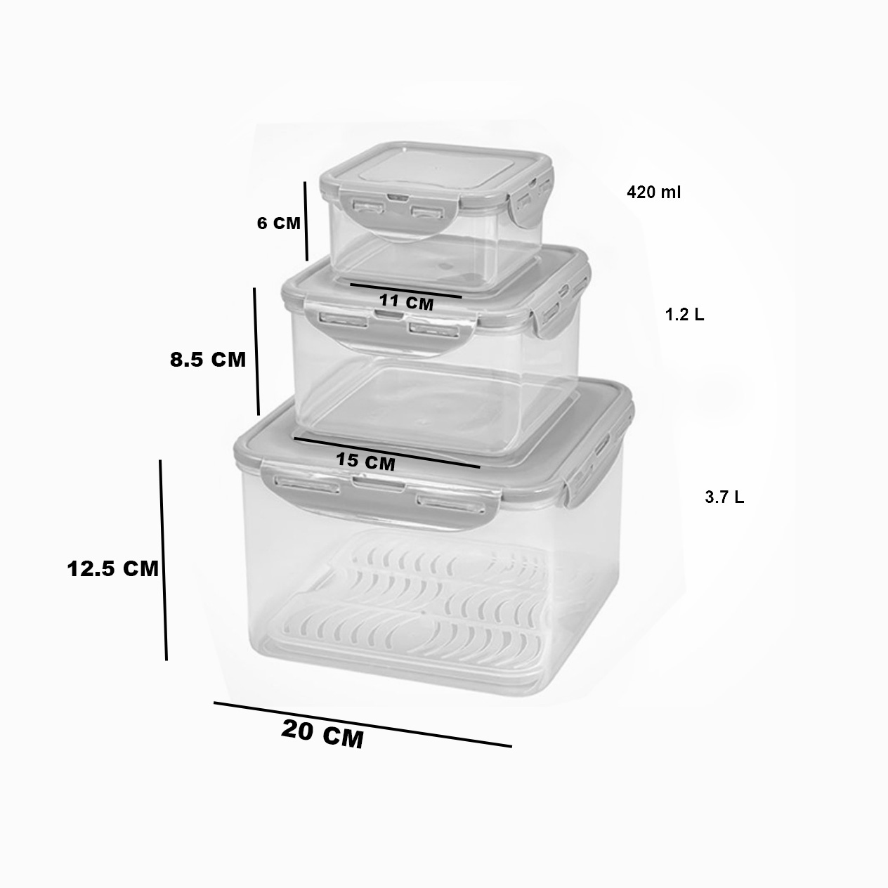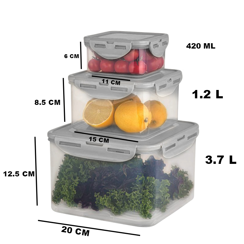 It’s a set of 3 square shaped food container with the capacity of 420 ml,1.2Liter, 3.7 Liter