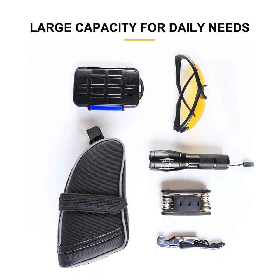 2. LARGE CAPACITY: Please attention, the size of bike saddle bag is 8.3 x 3.4 x 4.0 inches, the bike tire repair tool kits, cycling accessories, etc. There are three elastic mesh pouches inside the main pocket, which can be used to hold some valuable small items. This design can effectively prevent the internal items from falling when the waterproof zipper is opened.