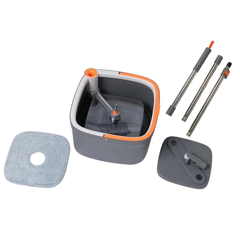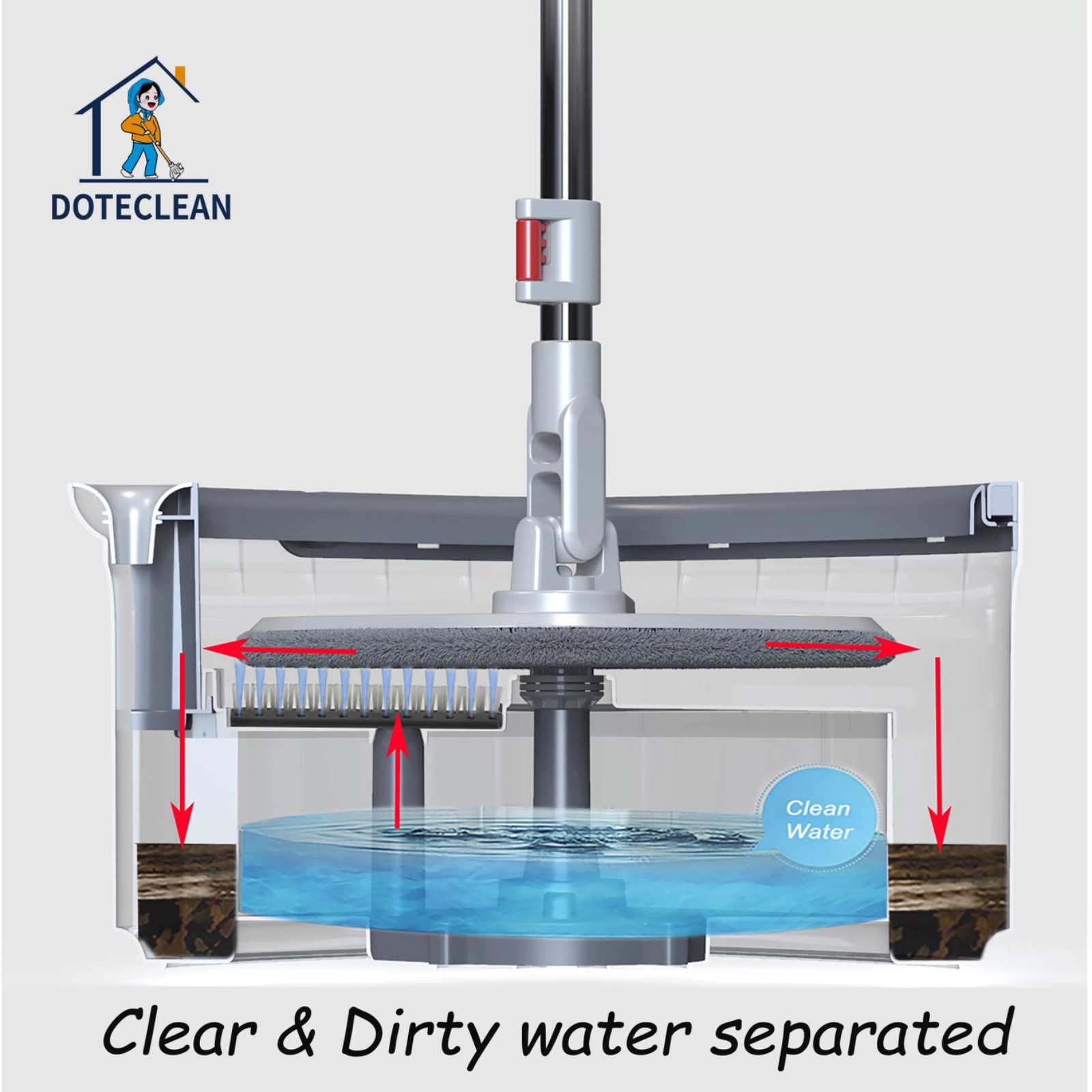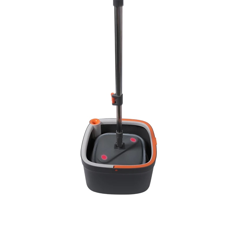 Self-washing and Wring Clean System - Open the switch lock under the mop handle, press it down and the mop head will spin. The self-contained cleaning brush in the bucket scrapes the stains on the mop pad and squeezes the water. Pad isn't dripping wet when you lift it to start mopping again.