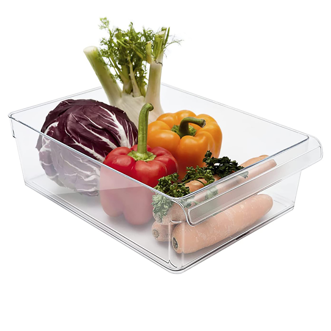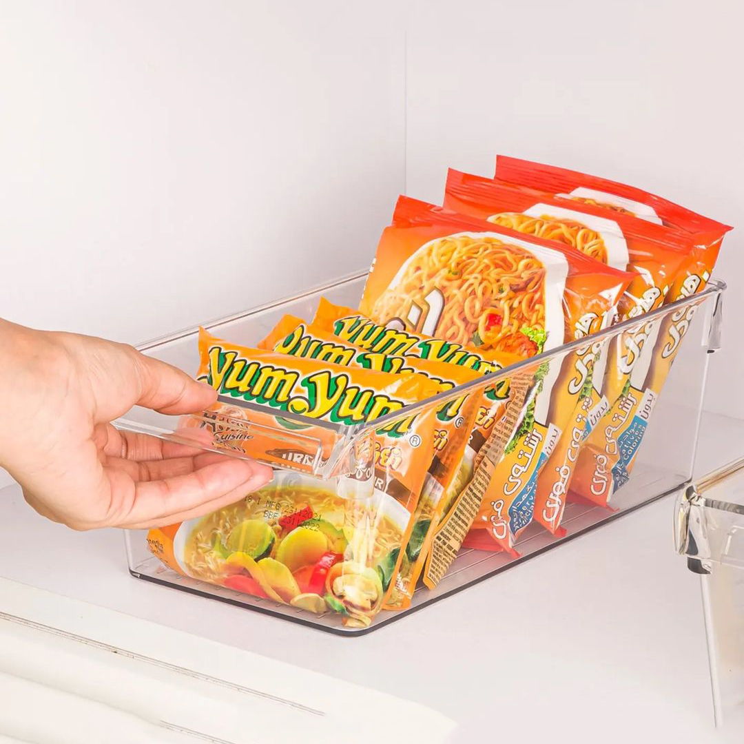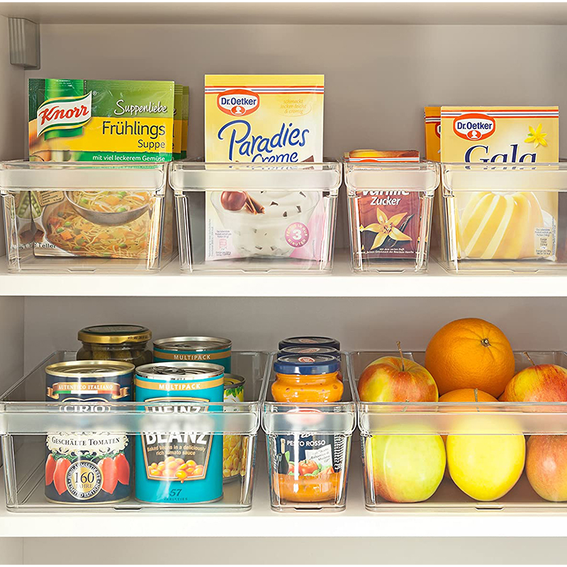 INTEGRATED HANDLE – The plastic clear storage bins feature integrated handle that allow for quick access and easy reorganization; built-in feet slightly elevate the bin off of the fridge, freezer, pantry, and cabinet shelves