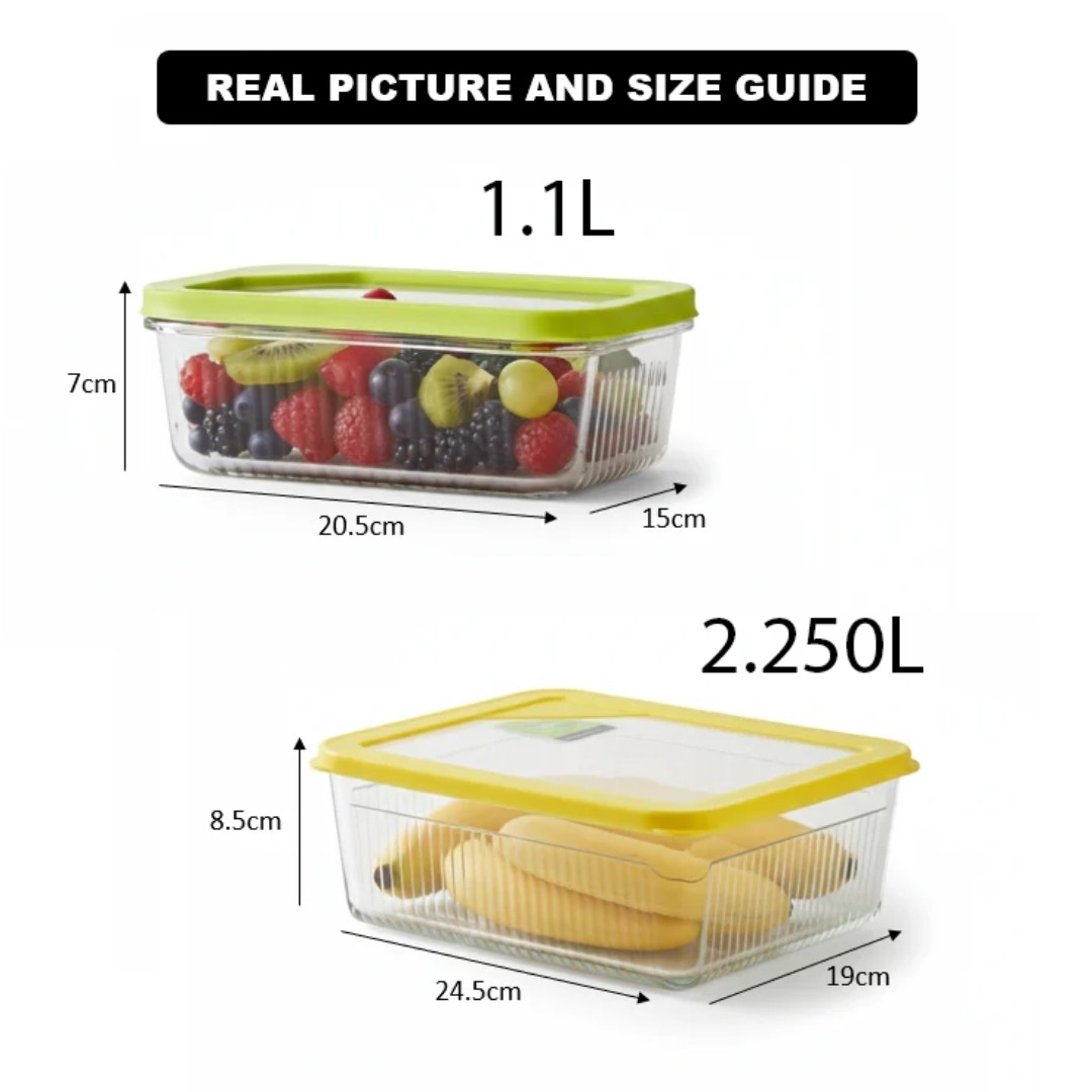 This glass container set offers three convenient sizes: 450 ml, 1.1 liters, and 2.25 liters, each available in four vibrant colors - yellow, orange, green, and red