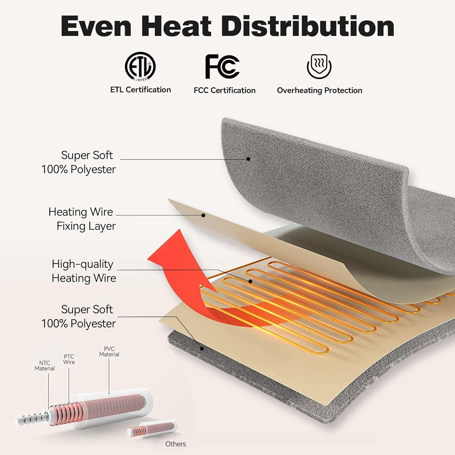 Fast Heating & Simple Operation: This electric blanket with fast heating design will provide you with instant warmth in this cold winter. The high-quality heating wires are evenly distributed in the heating blanket, and there is a fixed layer to prevent the heating wires from shifting and distributing the heat evenly. The overheating protection function effectively avoids safety hazards, allowing you and your family to spend a warm and comfortable autumn and winter.