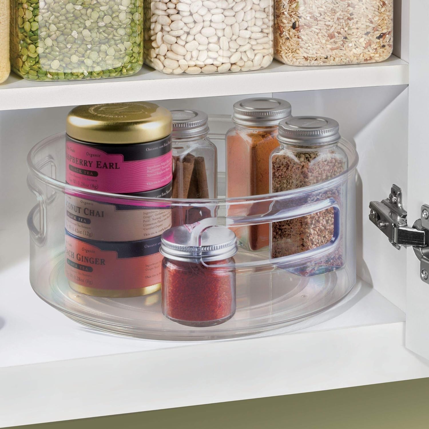KITCHEN SWIVEL PLATE ORGANIZER WITH HANDLES - Provides efficient rotating storage space for kitchen and pantry items in cabinets, shelves or refrigerator