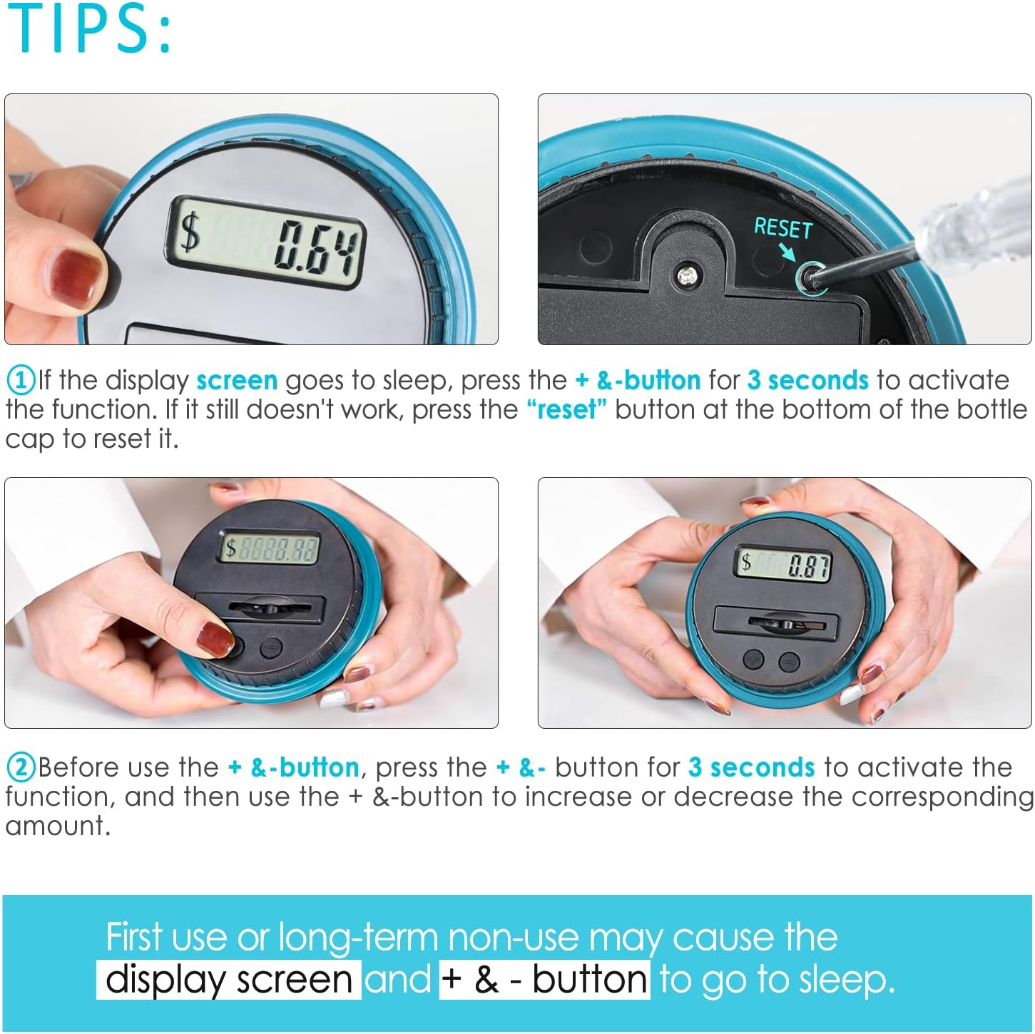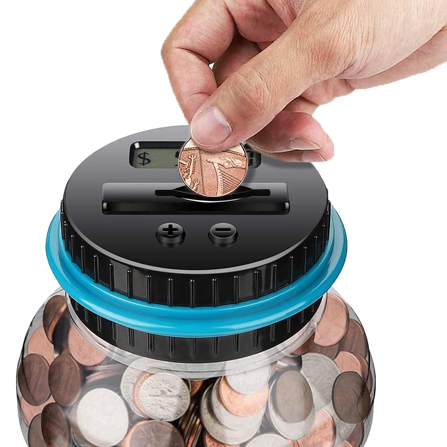 It accurately counts your money and display the total for every deposit. Just slip in your coins and the digital coin counter does the work for you! It is design to accept all American circulated coins, from pennies to dollars. Large capacity up to 2.5L can storage 800-1000 coins. Easy to twist, take off lid for your most convenience! Two small grooves on jar body make you hold it more easier. It also includes +/- buttons on the lid to allow manual.