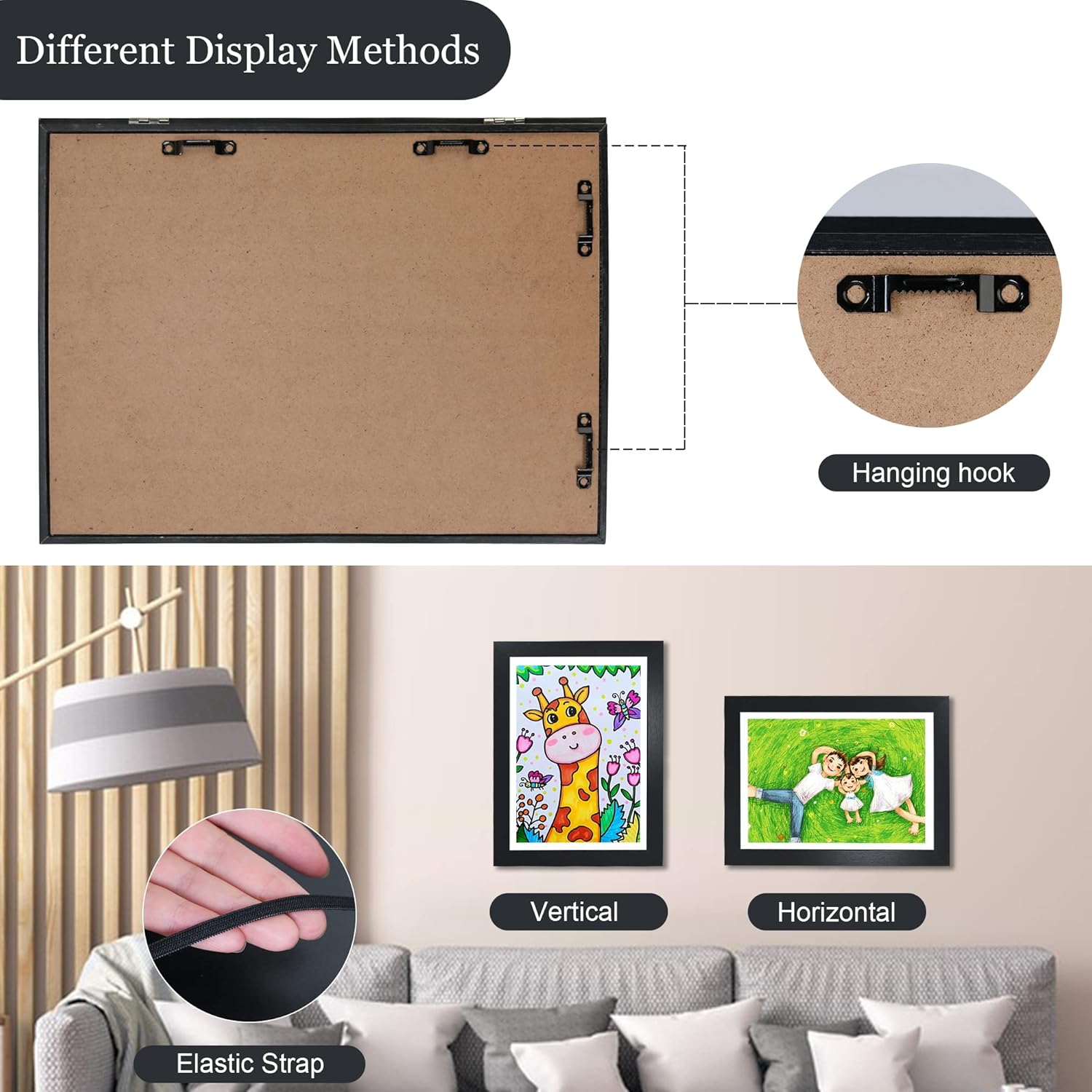 Easy To Use: This artwork display is perfect for changing pictures directly from the artwork frame on the wall. The opening in the front allows you to open and close it just like a book. The built-in metal pins and elastic straps hold the painting in place well.