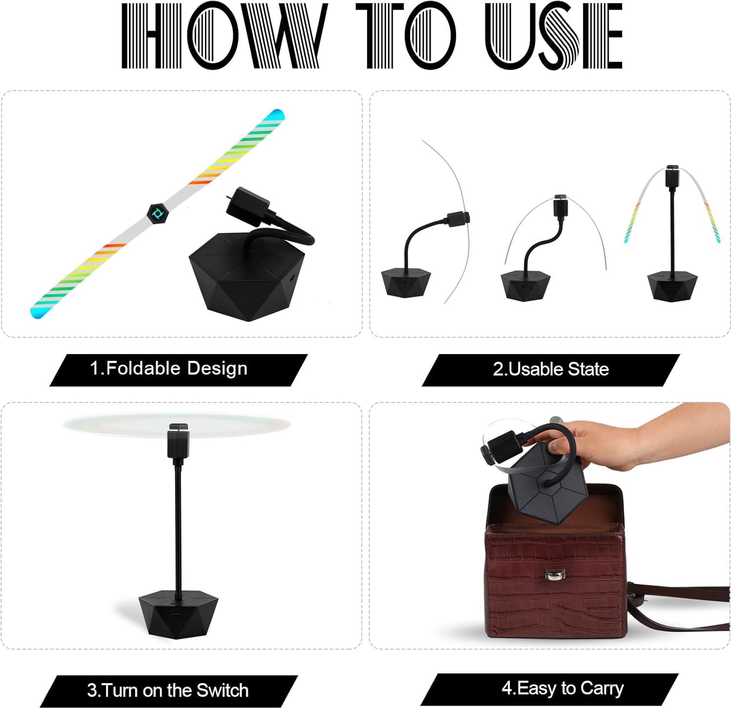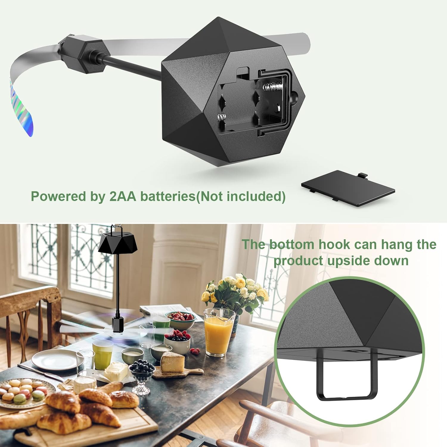 CUSTOMIZED REFLECTIVE PATTERNS ON BLADE: The blades of the table fly fans have reflective patterns designed for flies, which bend and refract light when rotating, creating an unnatural environment that stops flies from getting near the food, so they stay away from areas covered by light. A Portable fly fan creates a nice dining atmosphere for you.