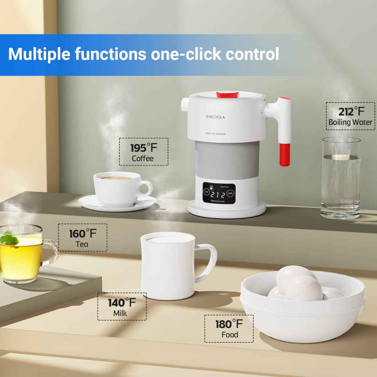 Multifunction: The portable electric kettle has boiling and insulation functions and can adjust multi-functional temperature presets (140°F 160°F 180°F 2200°F) The insulation time can reach 2 hours. One-button operation on the intelligent control display. Suitable for making coffee, boiled eggs, scented tea, green tea, black tea, oolong tea. Can be used to warm baby bottles