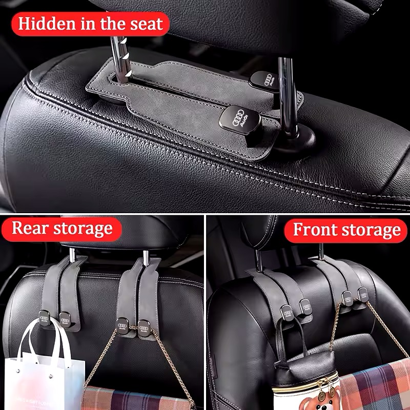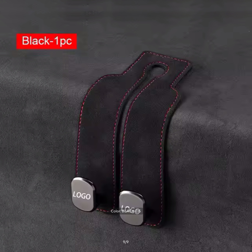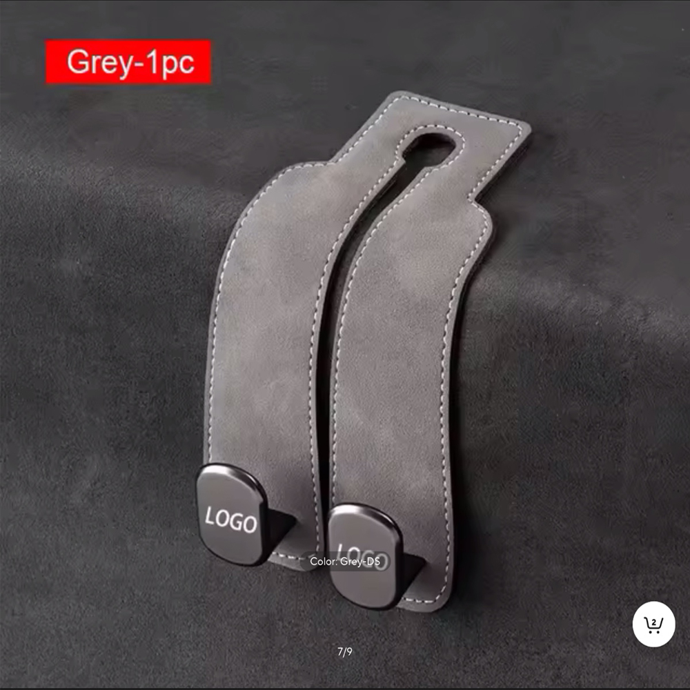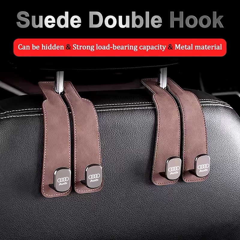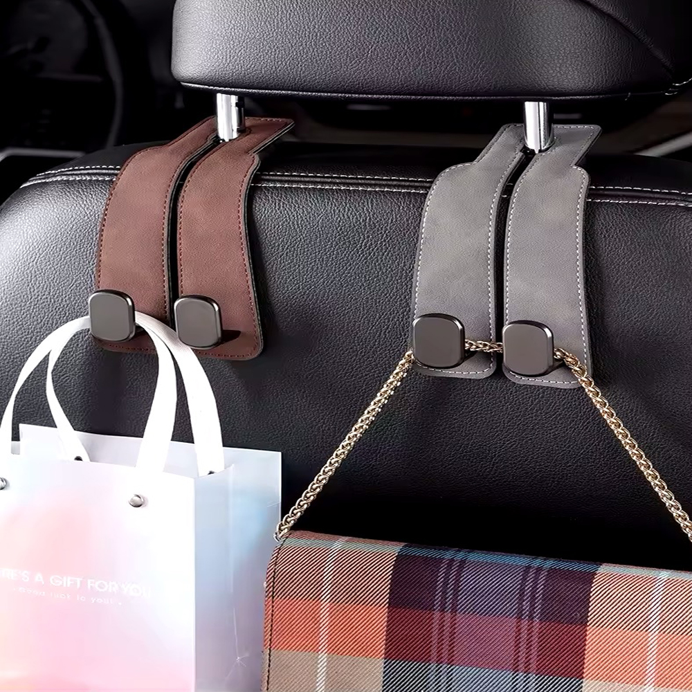 Quality Car Headrest Hook Premium Suede Rear Seat Hanging Dual Hook 20KG Large Load-Bearing Alloy Hook Hanger Universal. Useful for hanging bags to the back side of the seat and its very strong and also mobile or tap can be placed in the hooks.