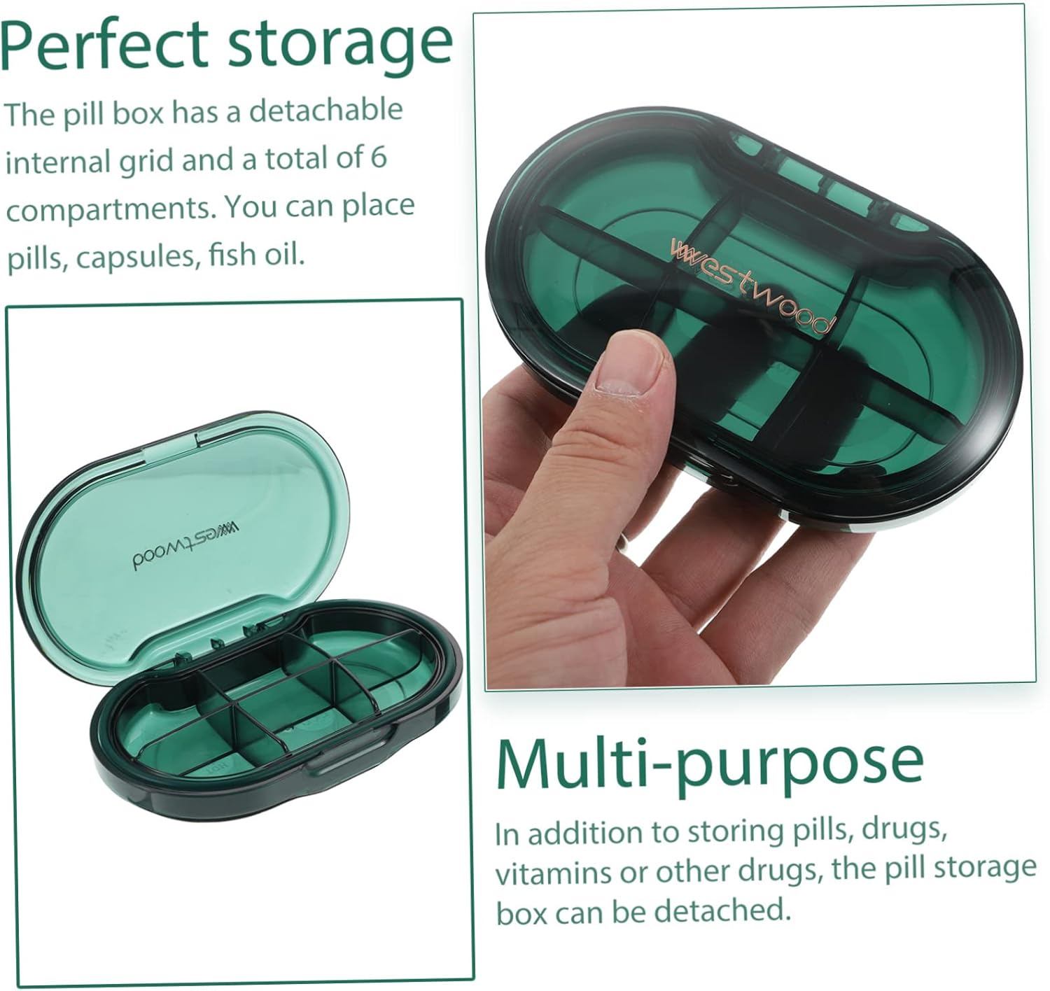 【Perfect Storage】Pill case has detachable internal grid with 6 compartments, you can place the tablets, capsules, fish oils and vitamins which depends on the size of your pills. It has a lock button, very easy to open for anyone but won't open automatically so as to keep the drug in the box.
