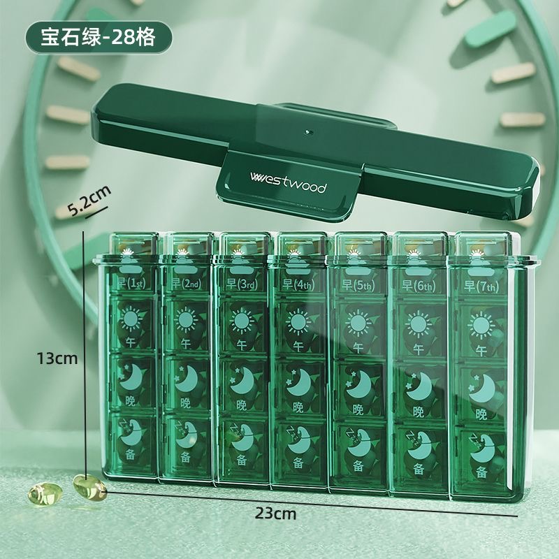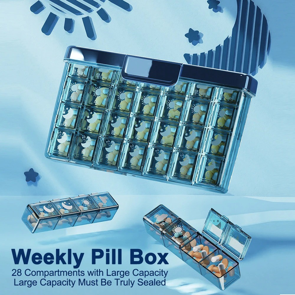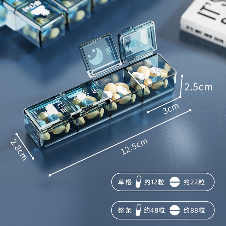 Individually separated pill case, this pill box has 7 removable boxes and each box has 4 separate cubic compartments, smooth surface won't adsorb any residue, which avoids mixing former pills residue to current pills and easy to clean.