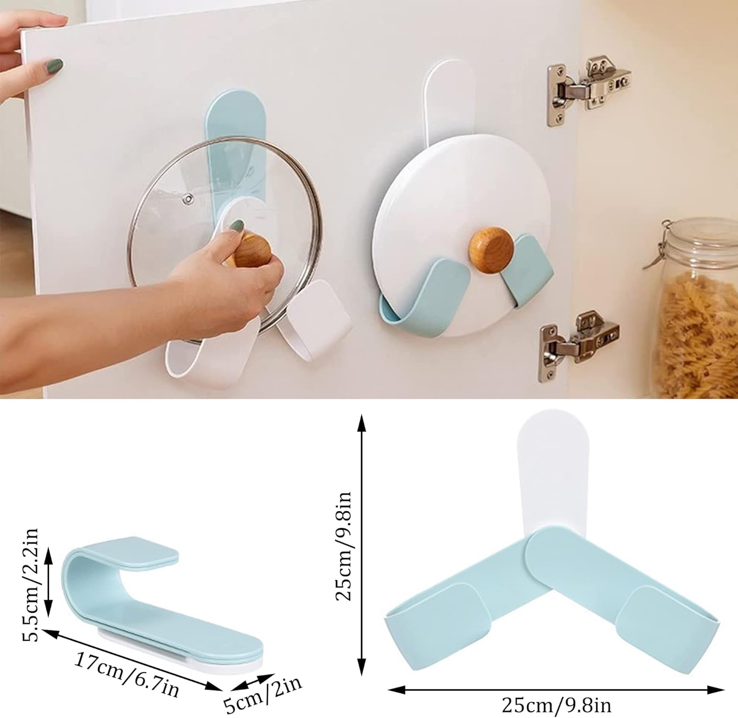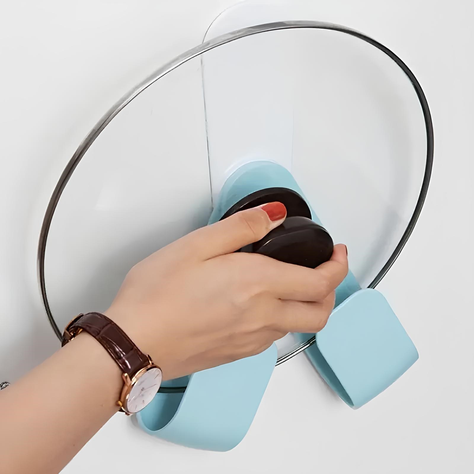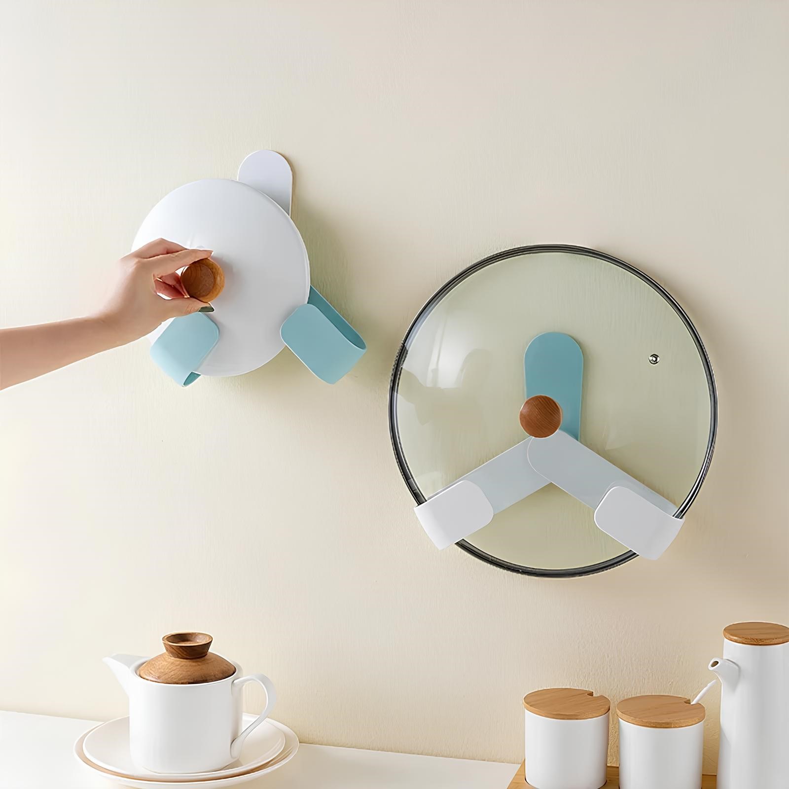 [Easy to install]: First clean the area where the cover bracket is to be installed, tear off the film of the bracket and stick it on. Wall mounted pot lid organizer has strong adhesion and load-bearing force.