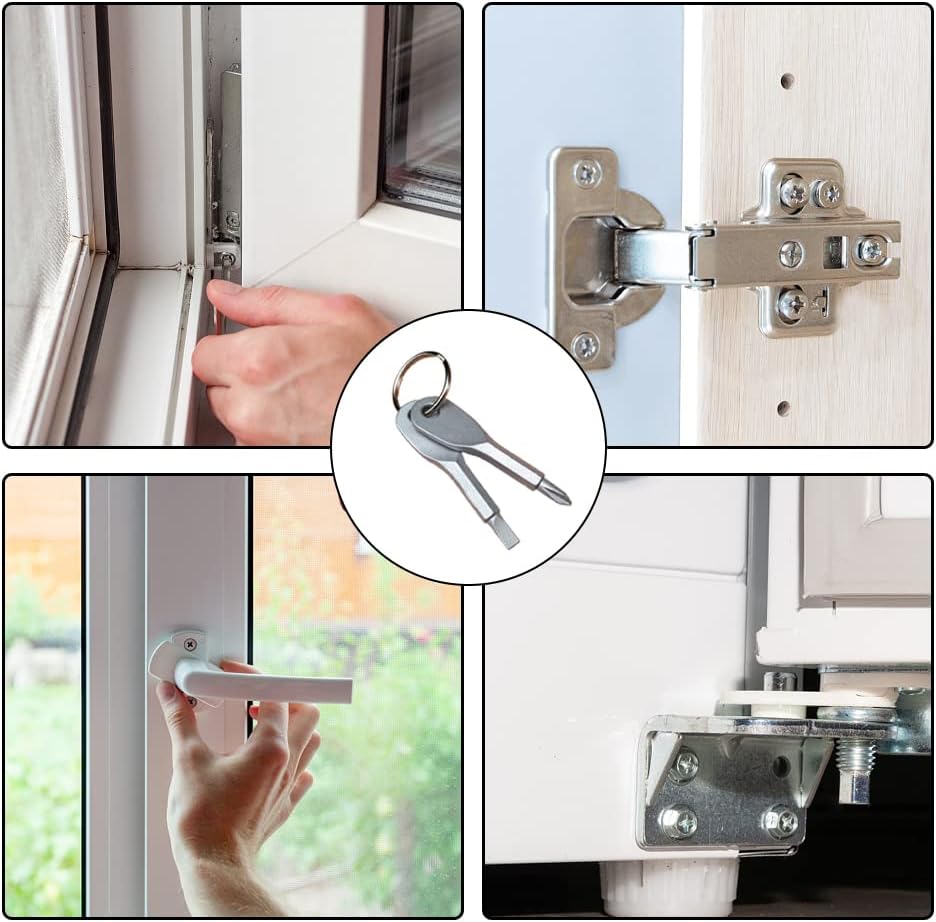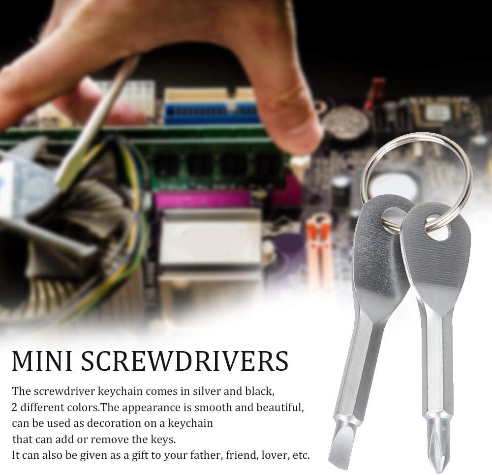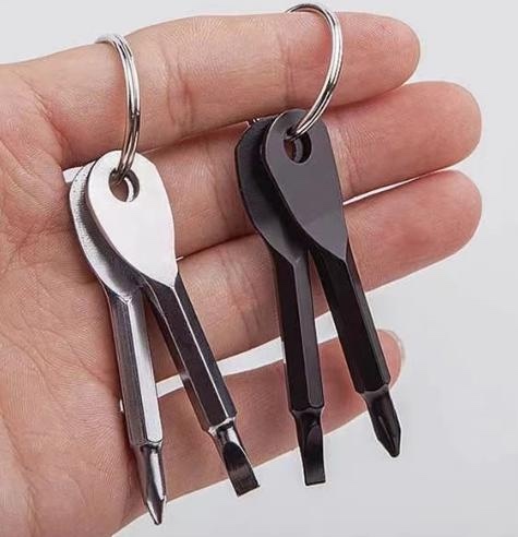 A set of 2 multi-function screwdriver tool keychains, including a flat head screwdriver and a Phillips head screwdriver