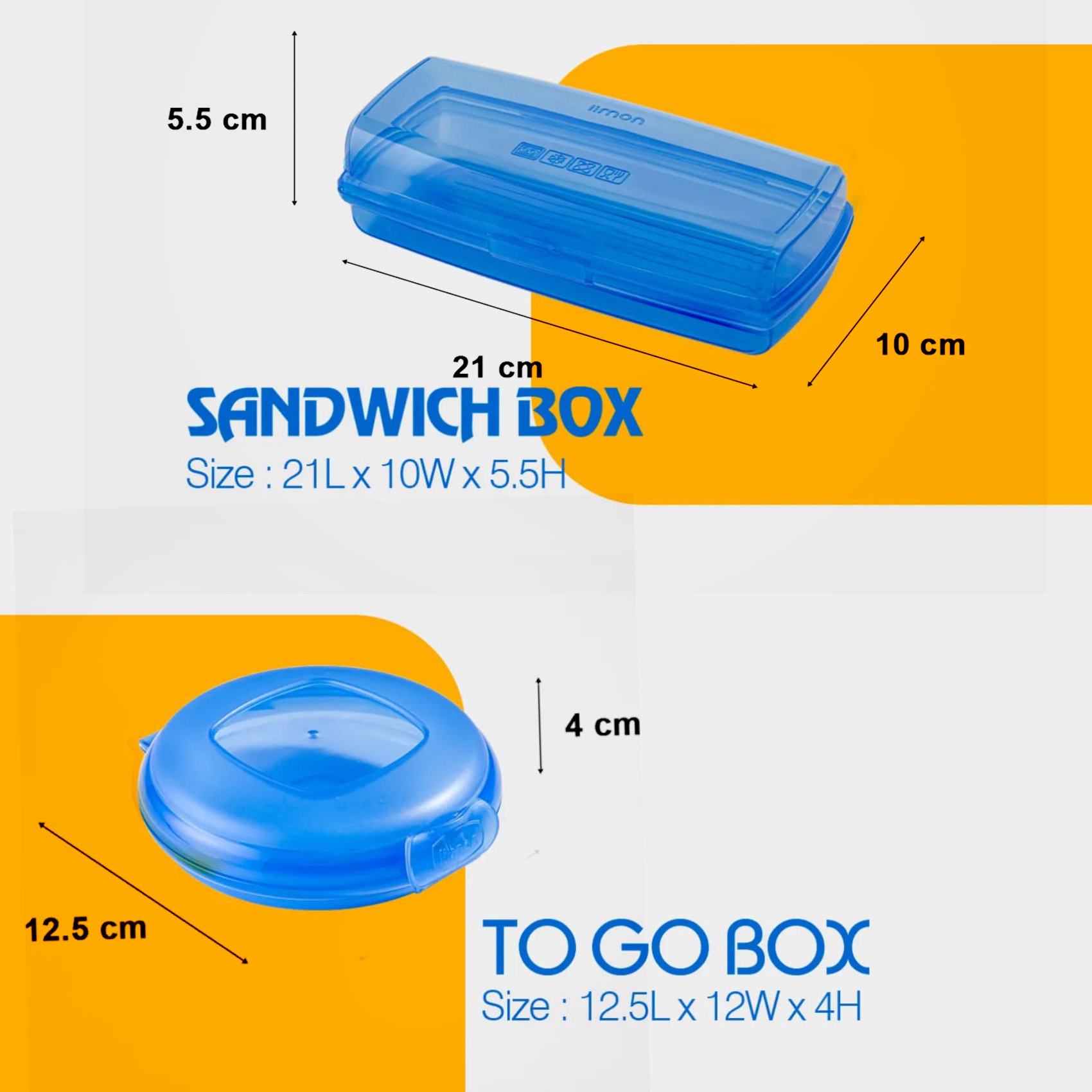 Compact Design: Sandwich container (21x10x5.5 cm) in vibrant colors – pink, blue, yellow, and orange.