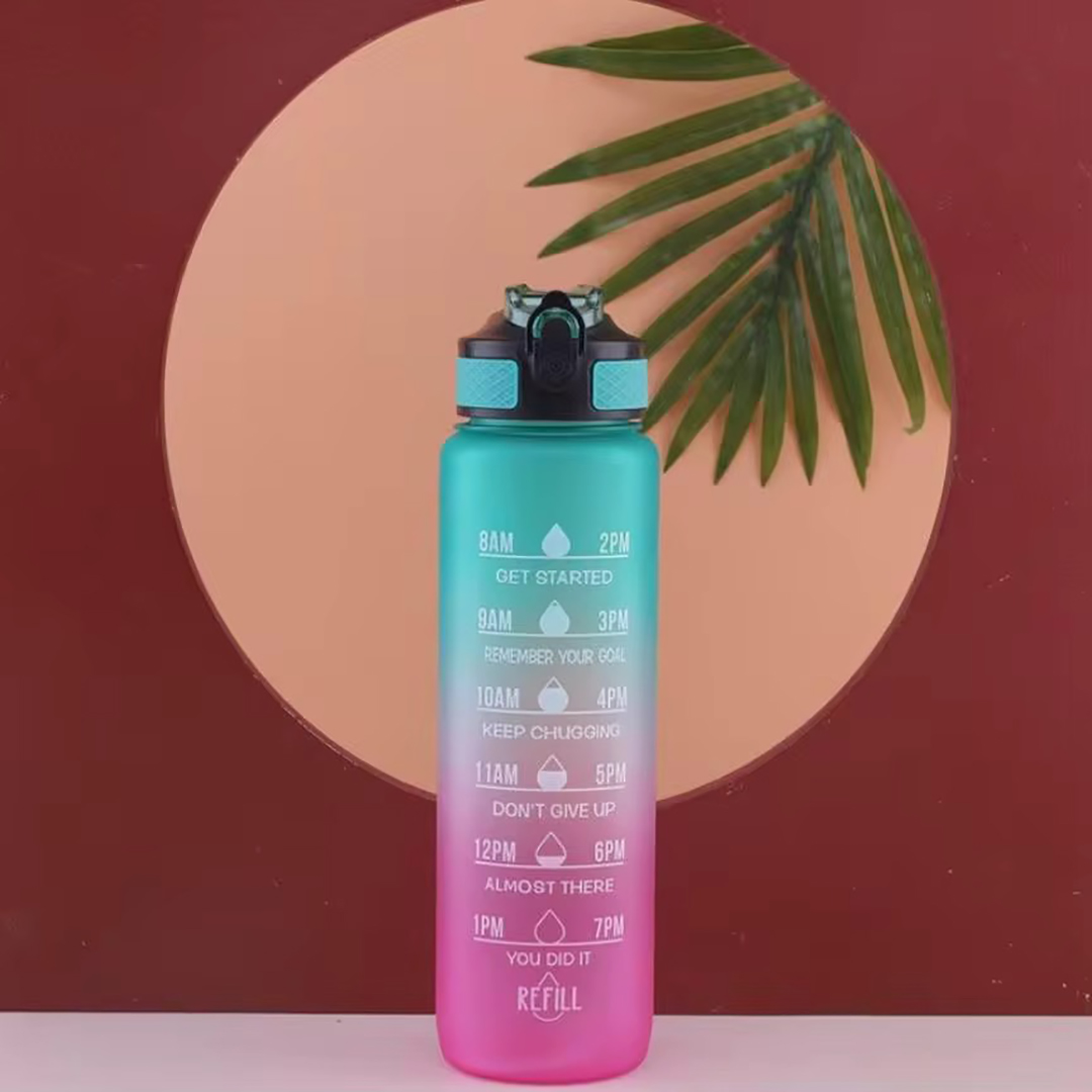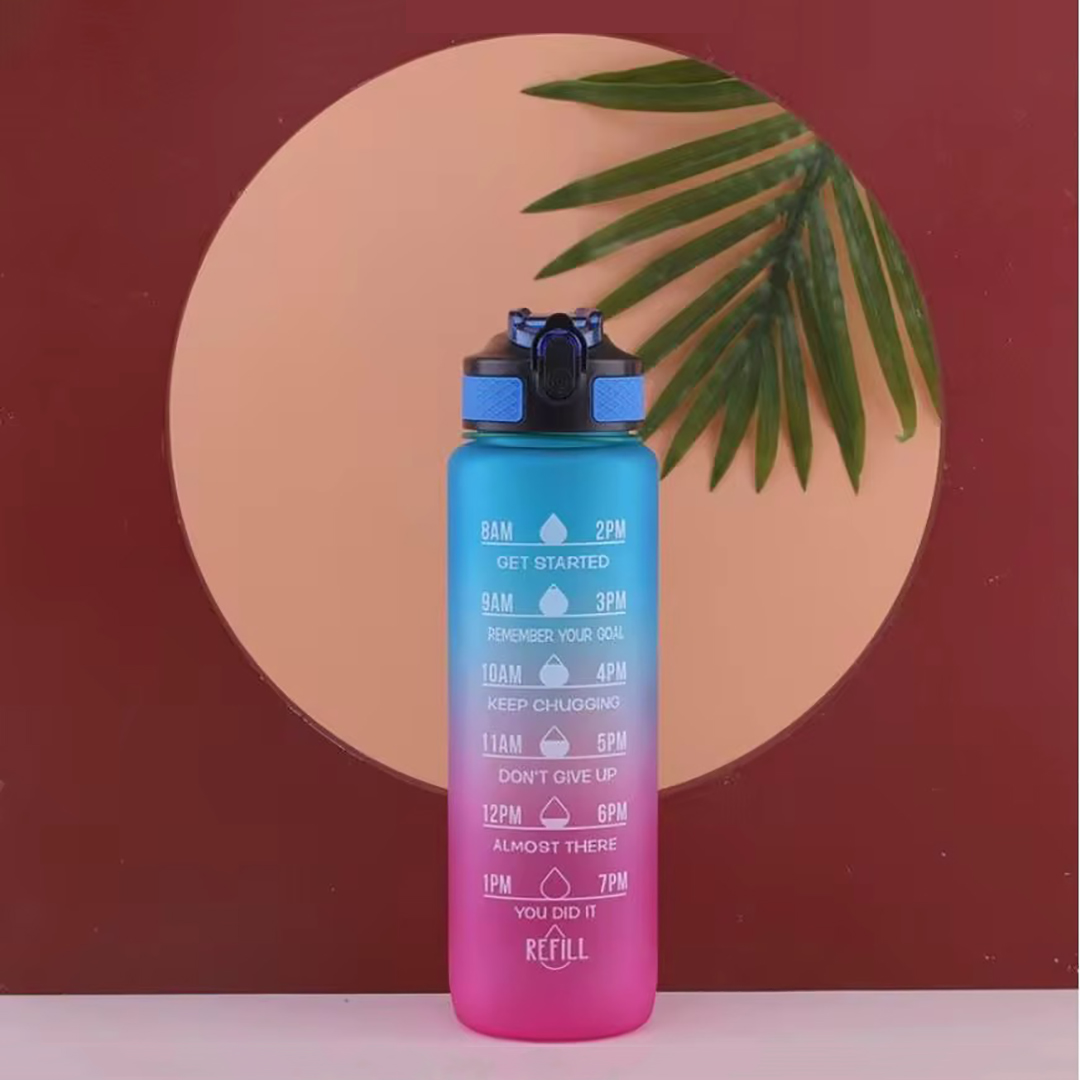 Motivational Time Markers: Features inspiring quotes and time markers to track daily water intake, promoting hydration and fitness goals.