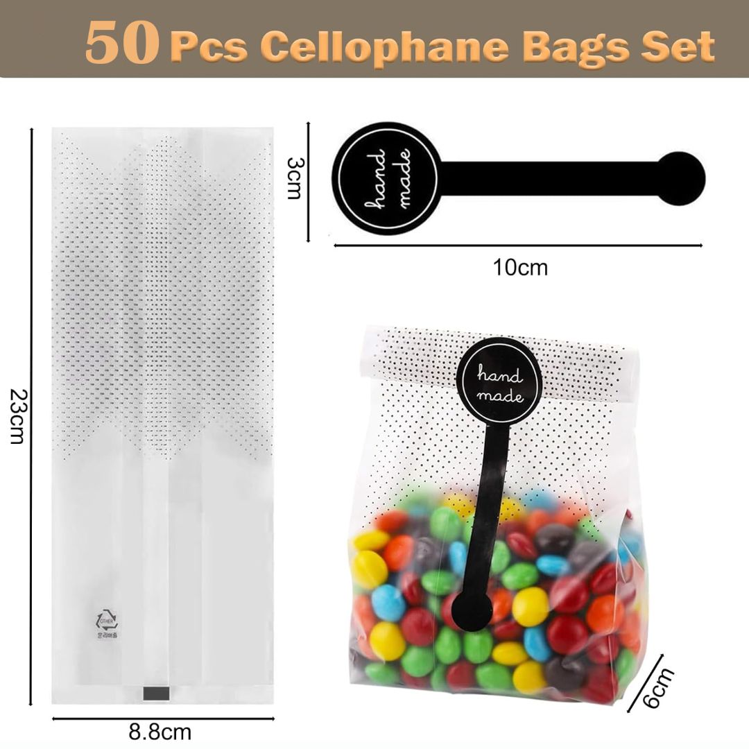 Pack & Size: Includes 50 bags (23 x 8.8 cm) and 50 black polka dot stickers (10 x 3 cm).