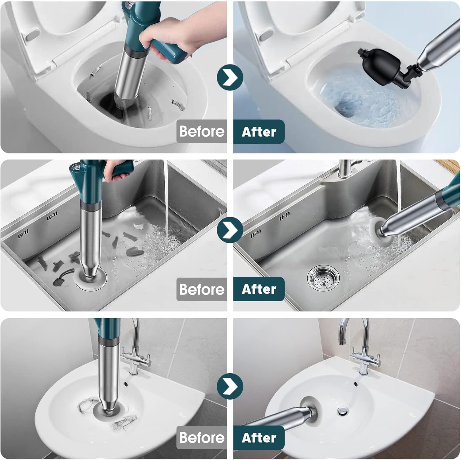 Powerful High-Pressure Unclogging – Uses strong air pressure to blast through stubborn clogs in seconds, making it a faster and easier alternative to traditional plungers and drain snakes. Ideal for toilets, sinks, tubs, and floor drains.