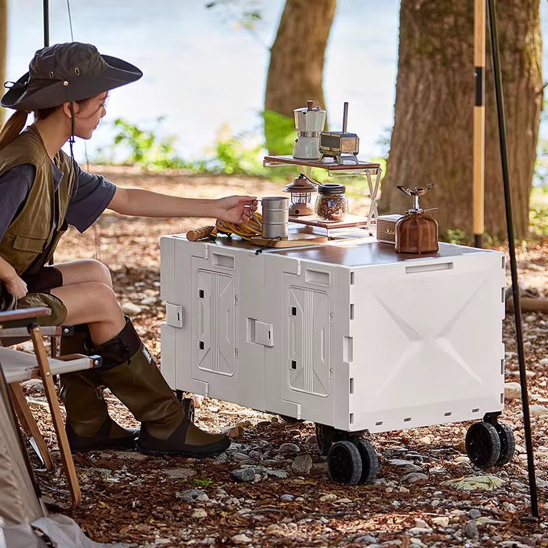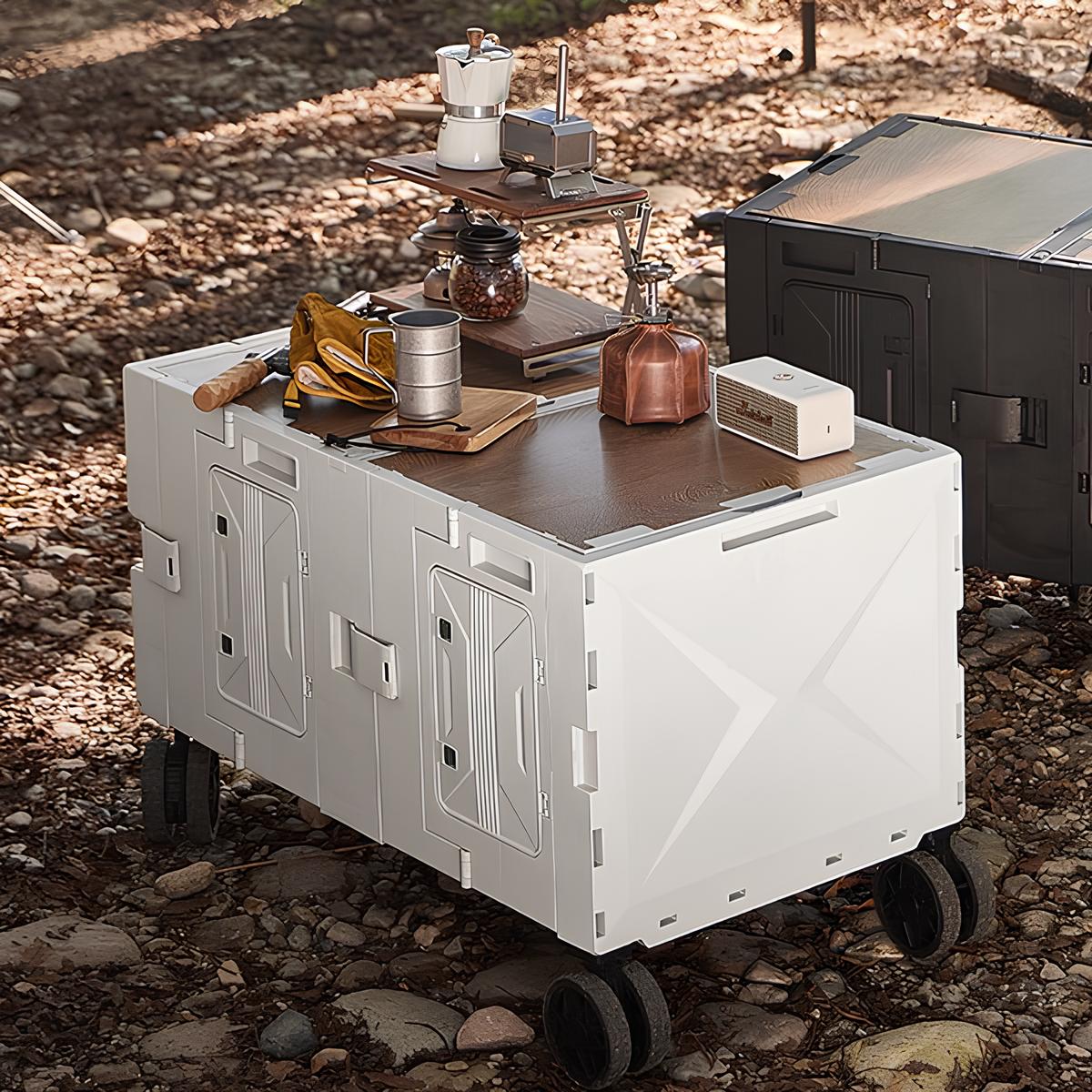 Portable Camping Kitchen – A modular, wheeled camping kitchen designed for outdoor use, offering mobility and convenience.