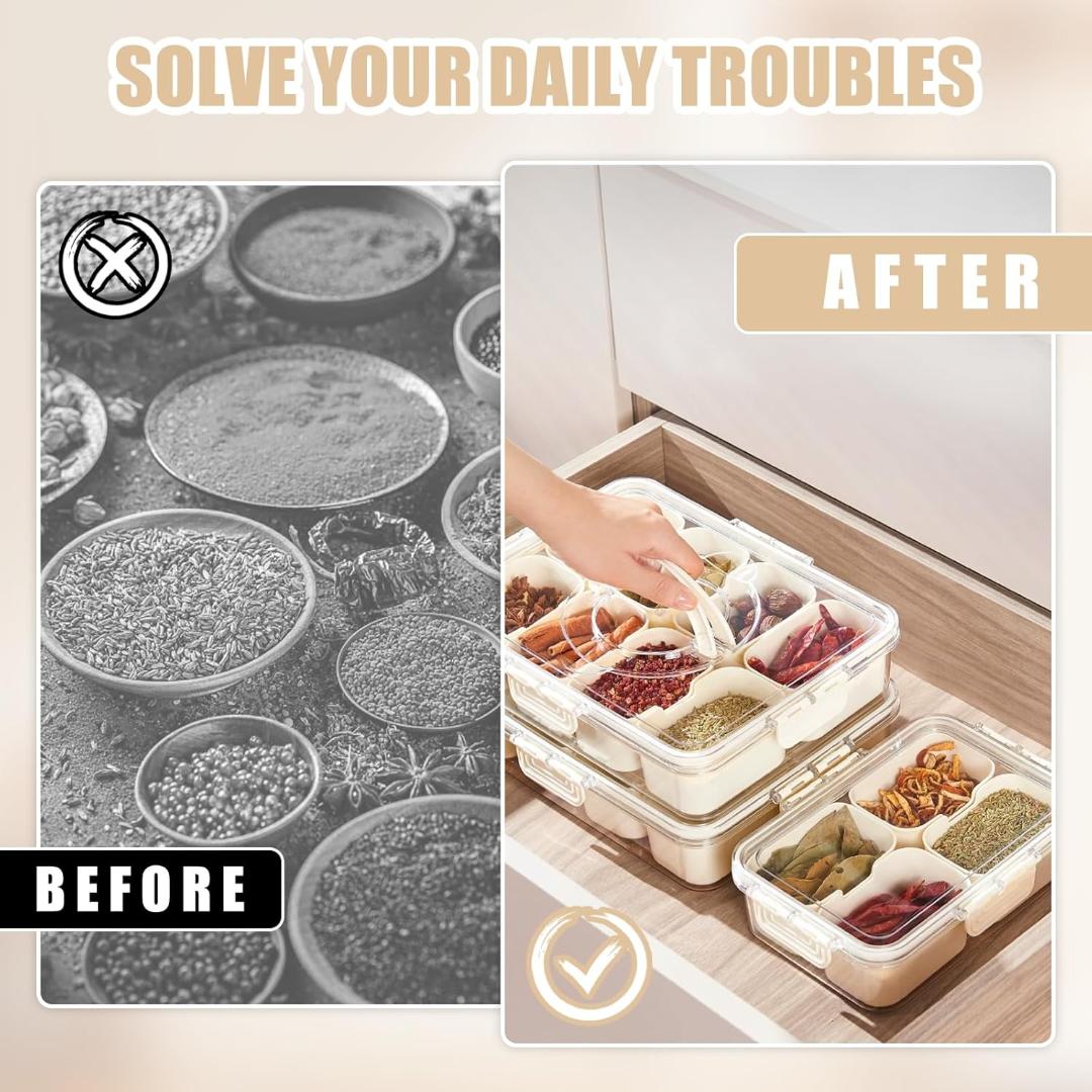 4-Compartment Design – Includes four separate sections to organize and store snacks, spices, dried fruits, nuts, and more without mixing, keeping your space neat and clean.