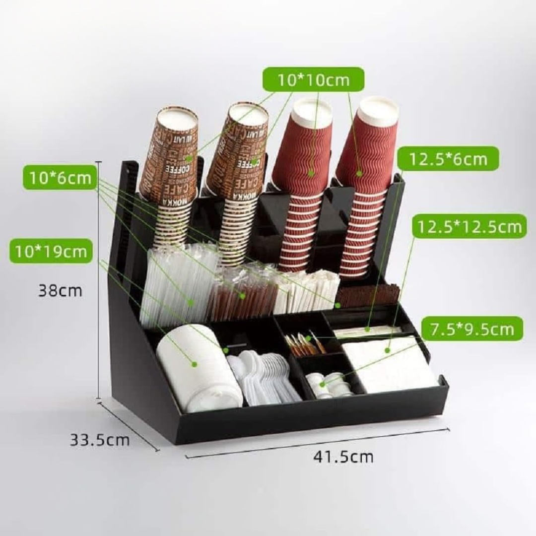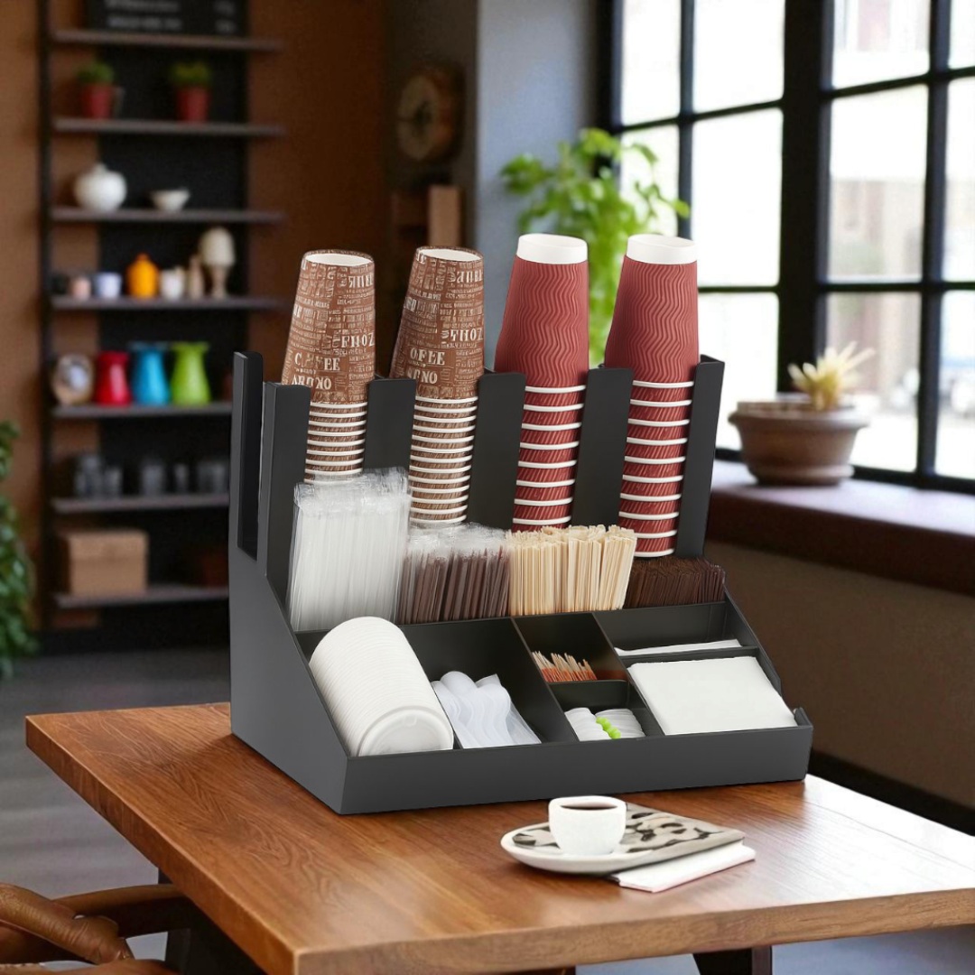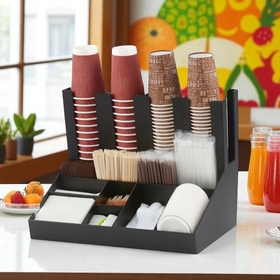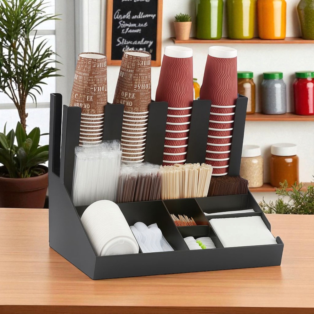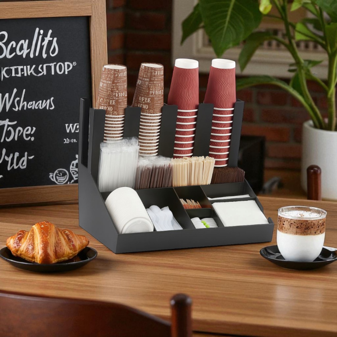 Multi-Tier Storage: This organizer features a tiered design with clearly segmented sections to hold cups, lids, stirrers, straws, napkins, and condiments—keeping your coffee station tidy and efficient.