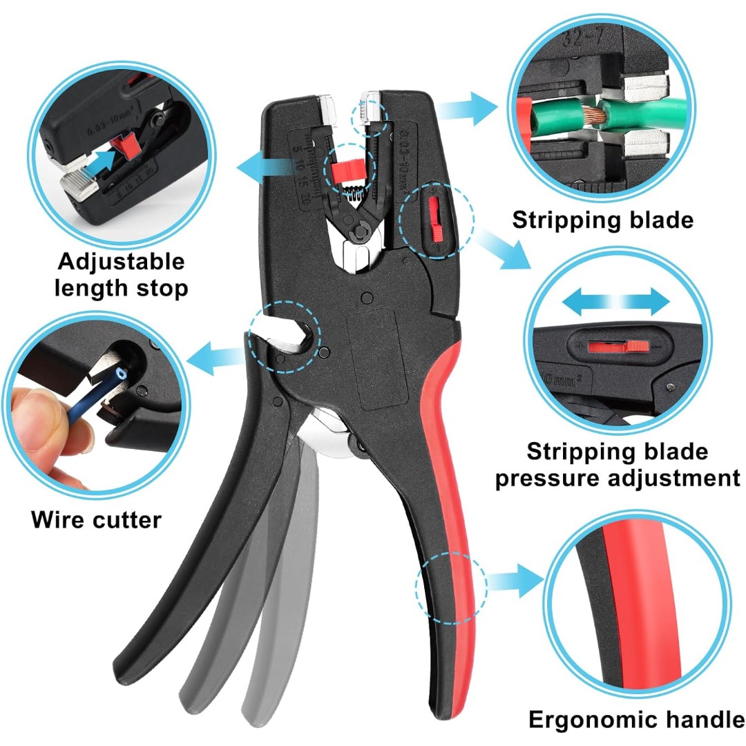 Wide Stripping Range – Handles 7–32 AWG (0.03mm²–10mm²) stranded and solid wires with adjustable stripping length from 5–20mm (0.25–0.75 inches).