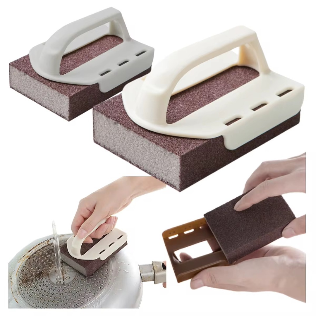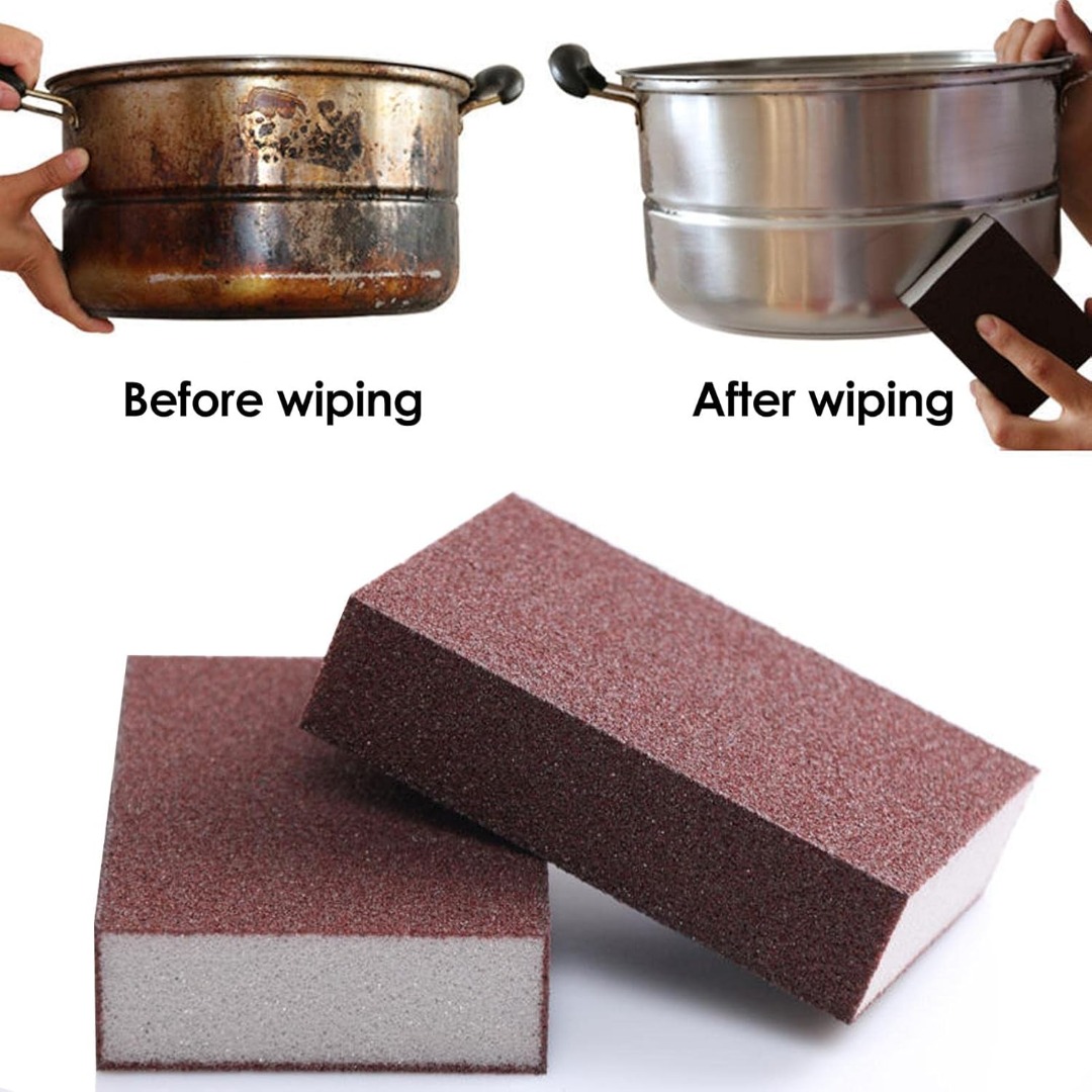 Magic Emery Sponge – Made with nano carborundum technology, this high-density sponge is tough, elastic, and effective for removing stubborn stains on pans, sinks, and utensils, as well as sanding wood, metal, and other surfaces.