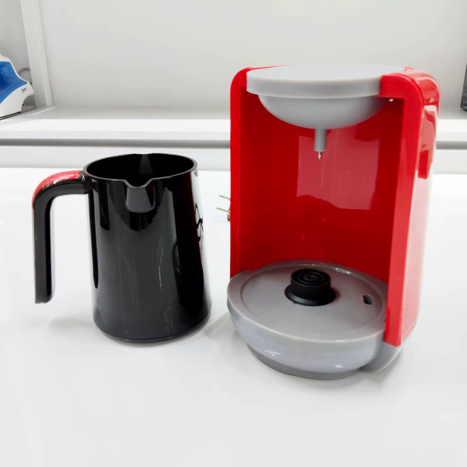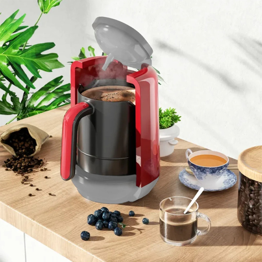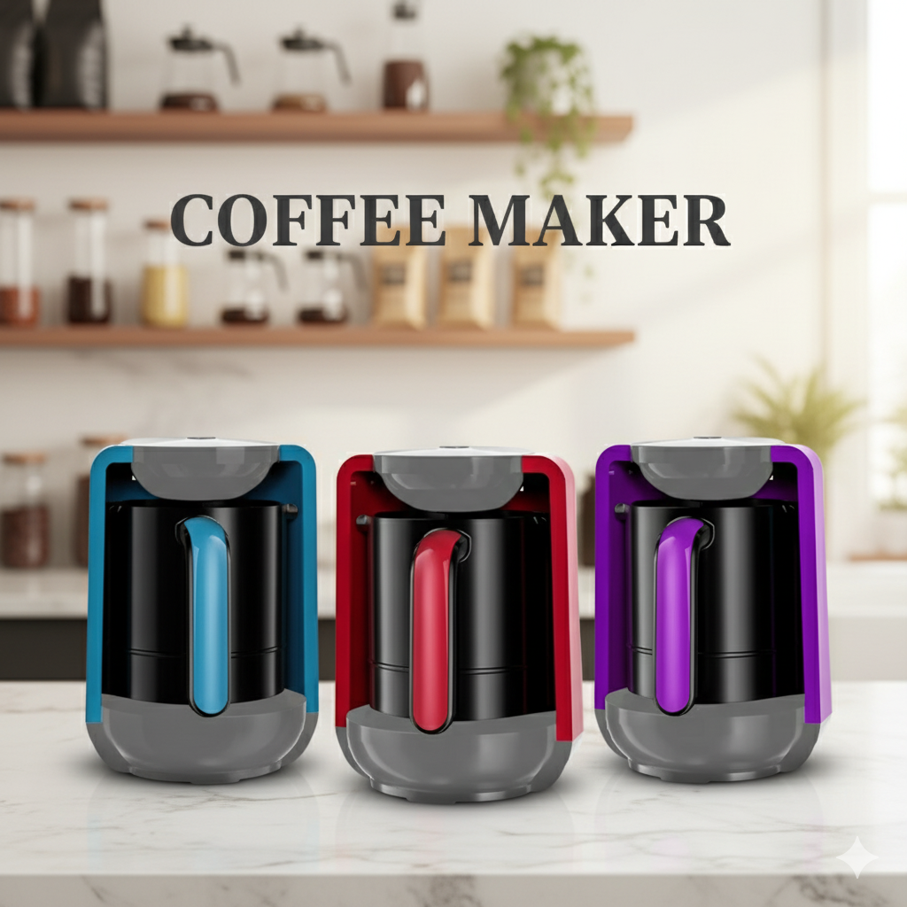 Sleek Modern Design: Compact and stylish coffee maker with a glossy finish available in vibrant red, blue, and purple color options.