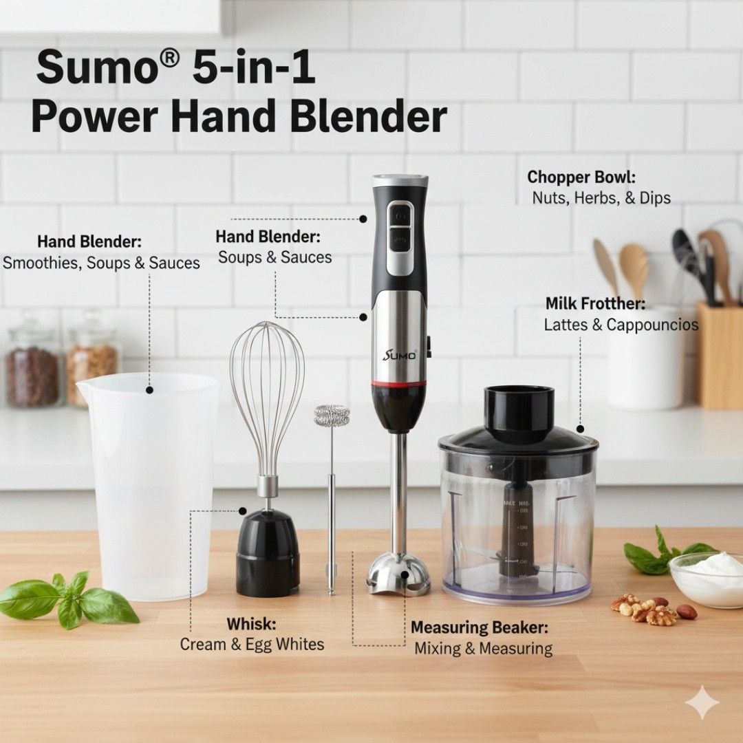 Powerful 5-in-1 Design: Combines a hand blender, whisk, chopper, frother, and measuring cup in one compact, versatile kitchen tool.