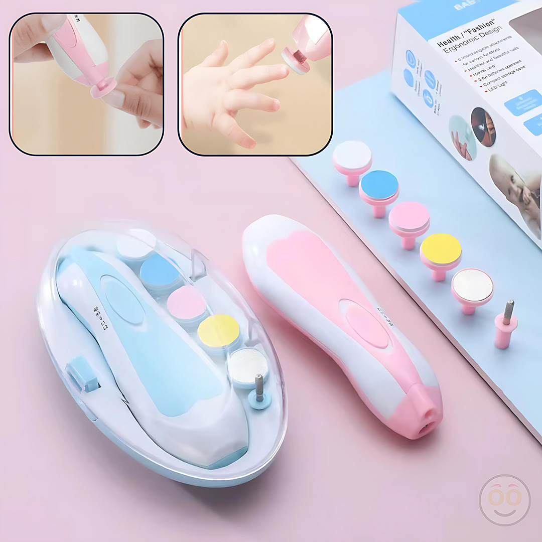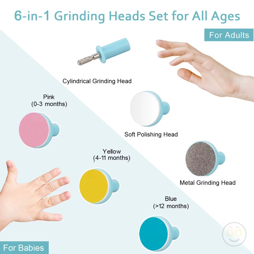 Six Gentle Filing Heads: Comes with multiple cushioned sanding pads designed for newborns, infants, and toddlers to safely trim nails at any age.