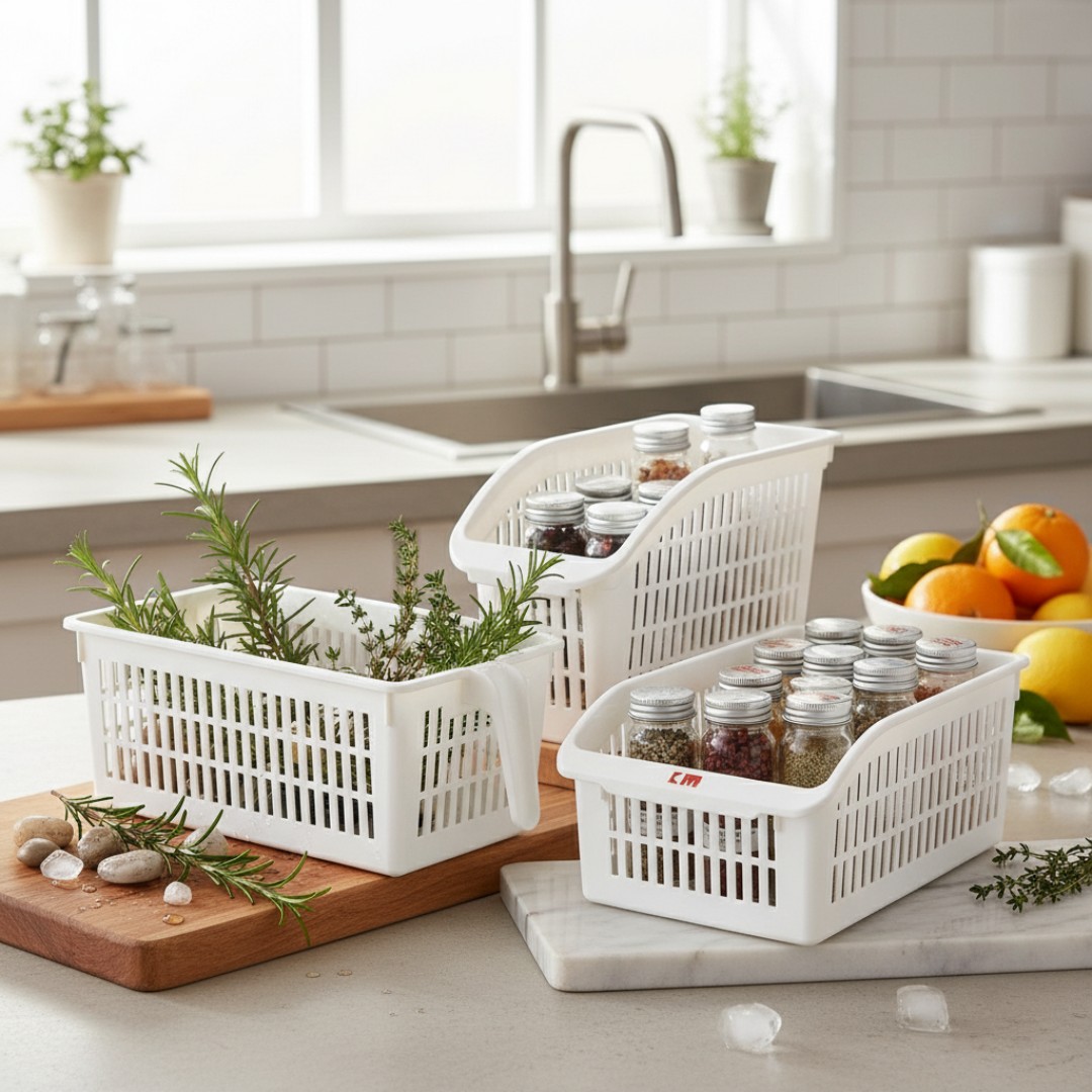 Multi-Purpose Storage Basket: Designed for organizing kitchen, fridge, pantry, bathroom, and household items, keeping essentials neatly arranged and easy to access.
