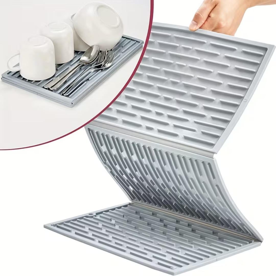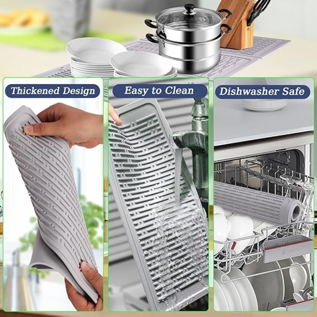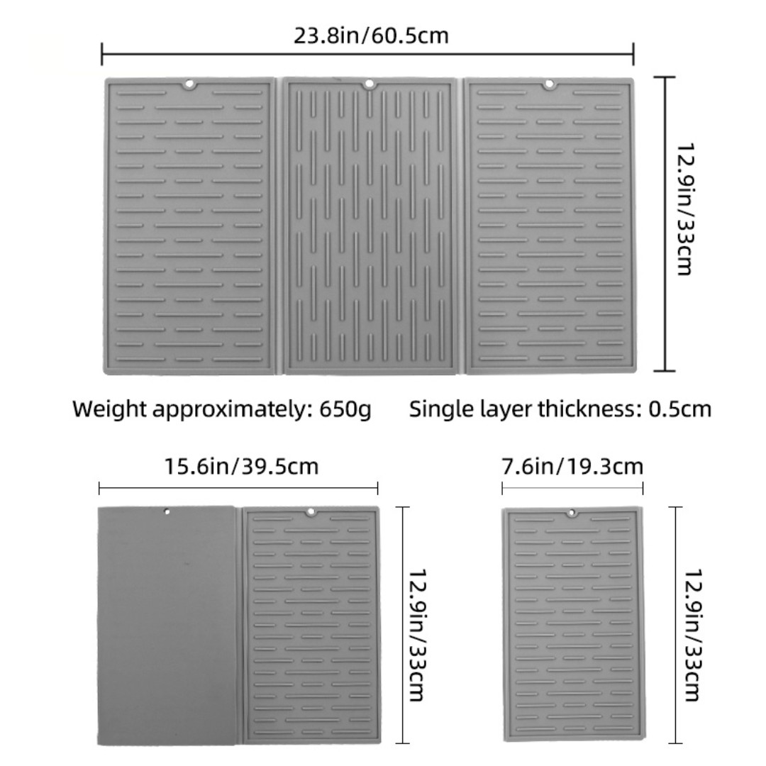Foldable Silicone Drying Mat: Large 60.5×33cm tri-fold design expands wide for drying dishes, cups, and cookware.