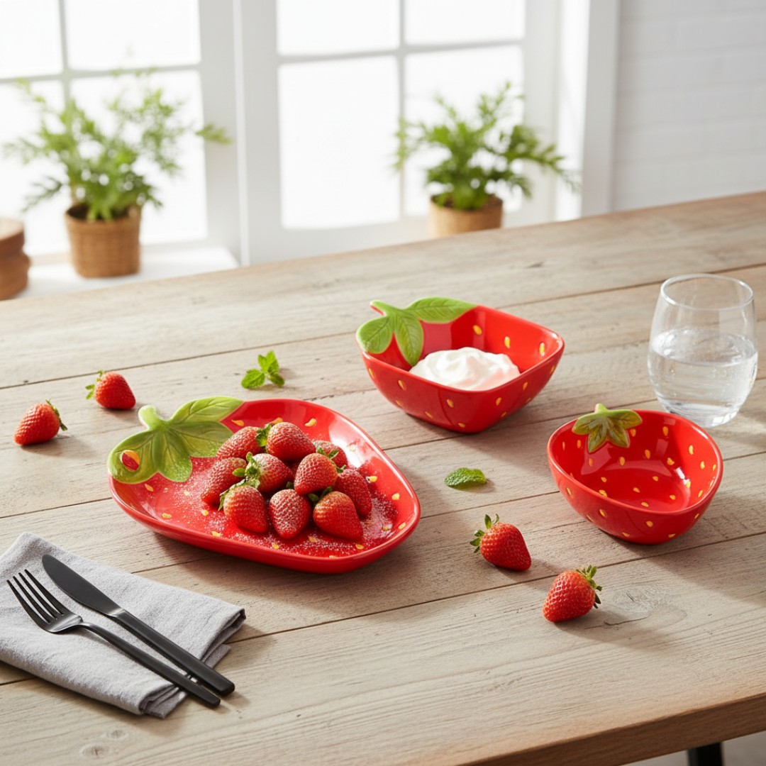 Playful Strawberry Design: Features a charming strawberry shape with vibrant red color and detailed green leaf accents that add a fun, decorative touch to any table setting.