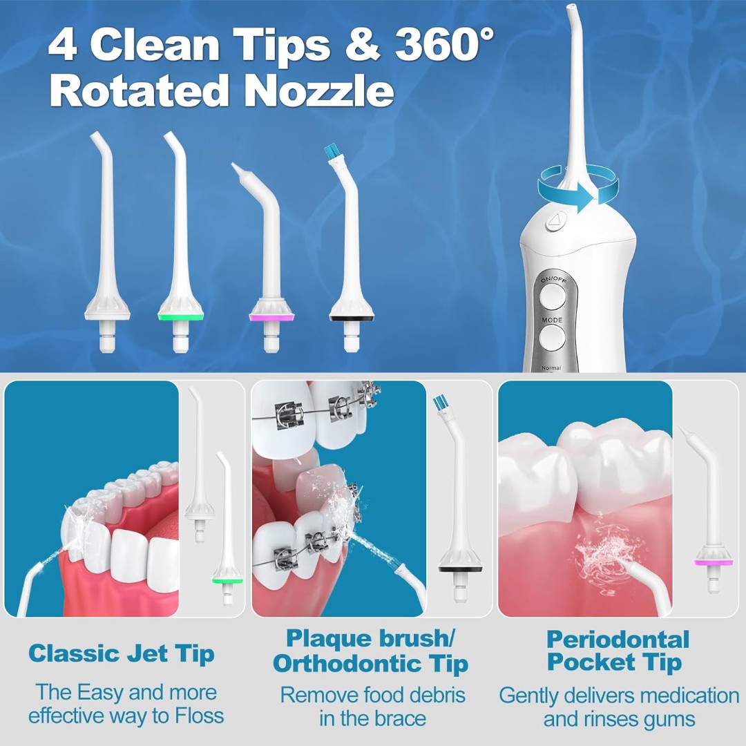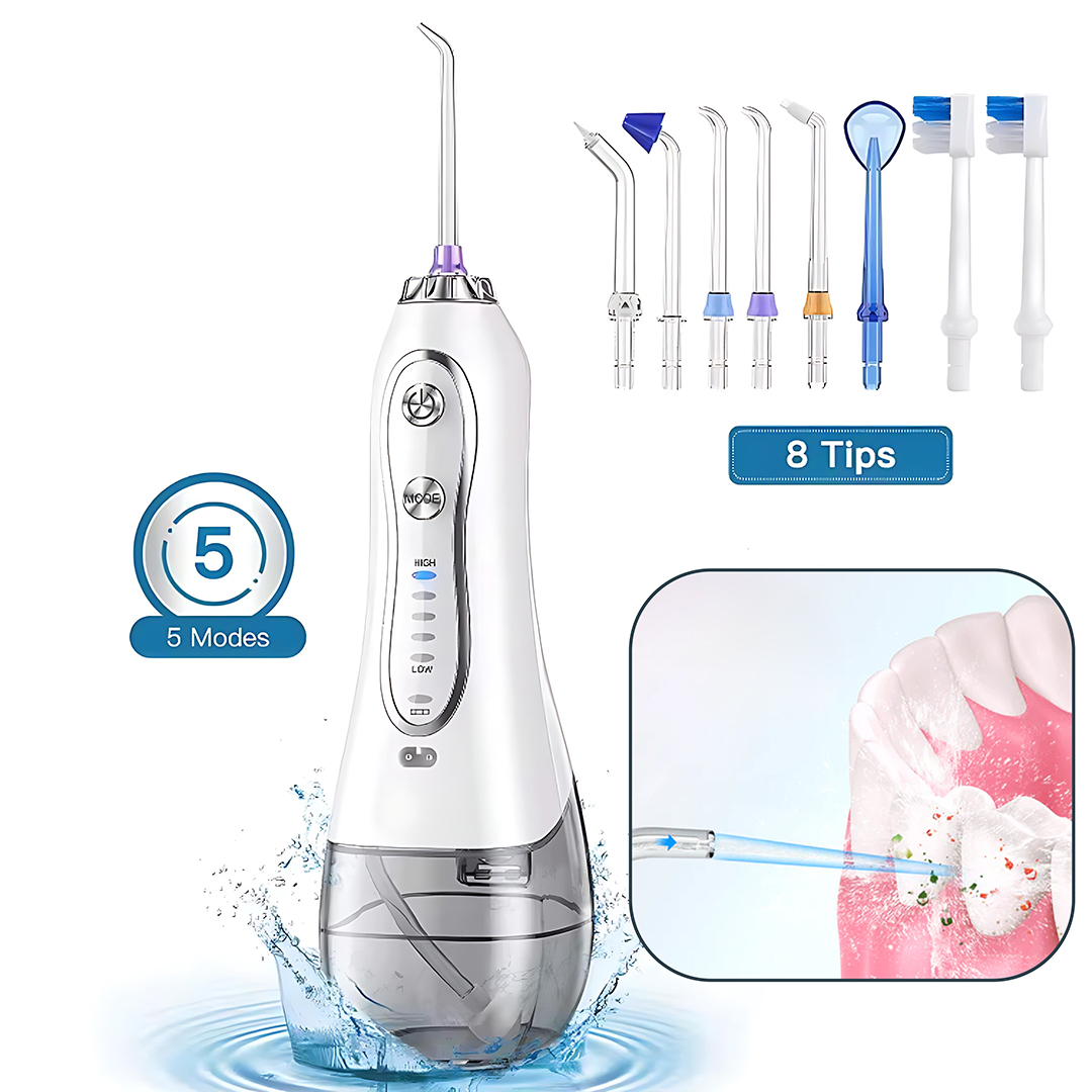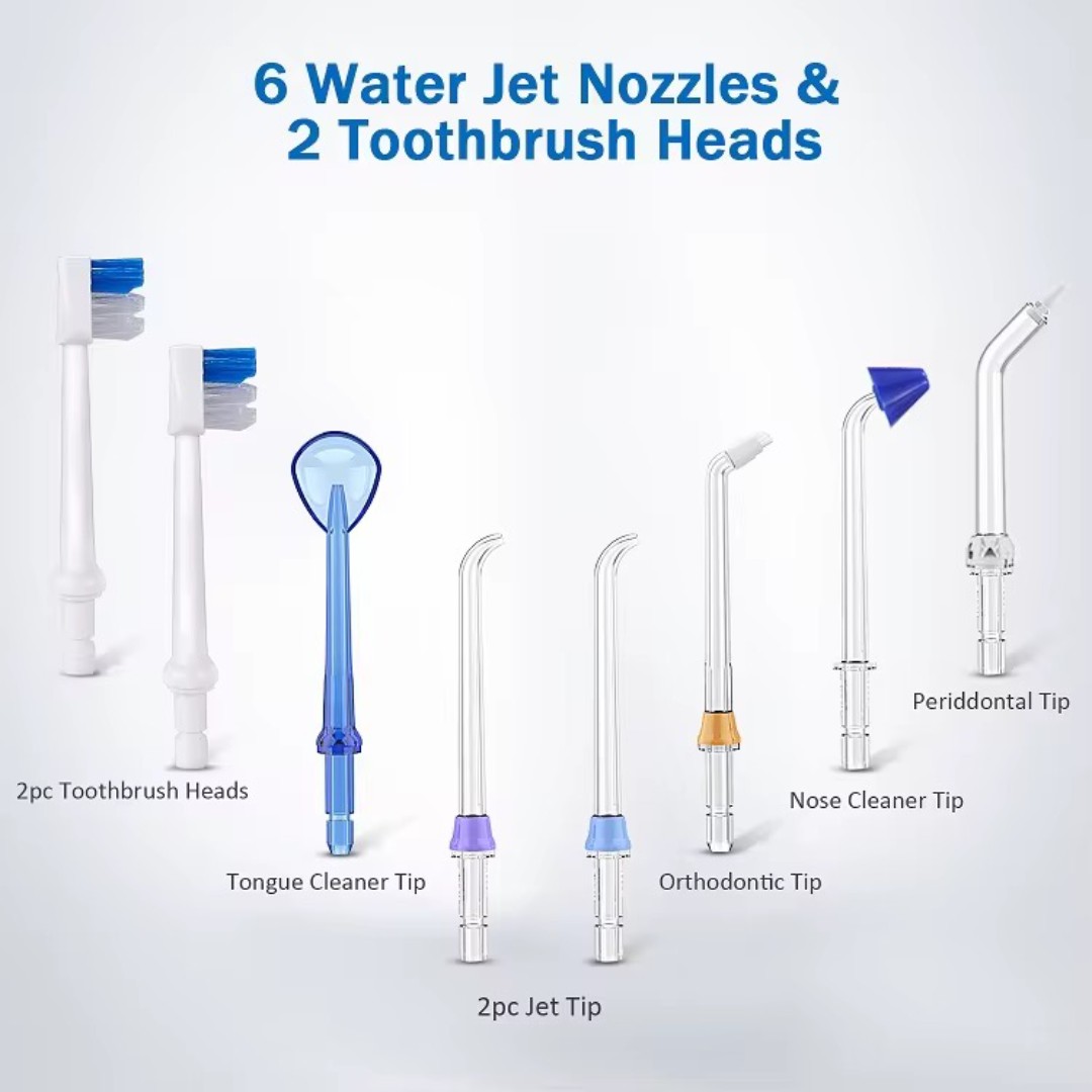 Multiple Cleaning Modes & Nozzles: Equipped with 5 adjustable modes and 6 interchangeable nozzle types to suit deep cleaning, daily use, sensitive gums, and beginner users.